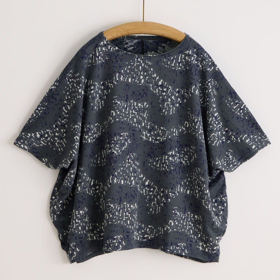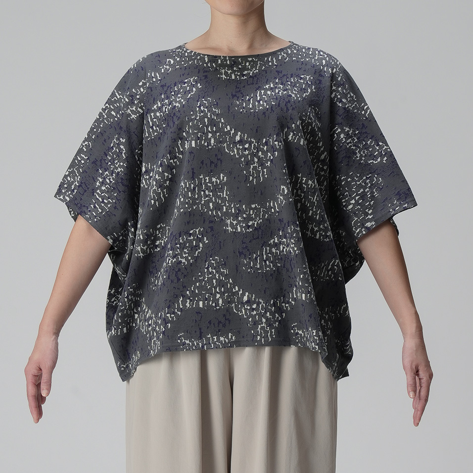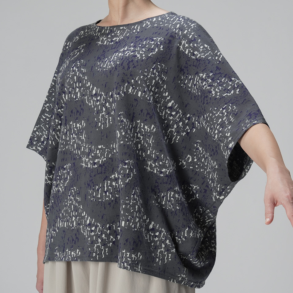 やわらかなカットソー生地を生かした、衣の中で体が自由に泳ぐようなワイドシルエット。揺らめくさざなみのような有機的な柄も美しく、春先には長袖インナーと重ね着して、ベスト風の着こなしも楽しめます。