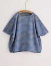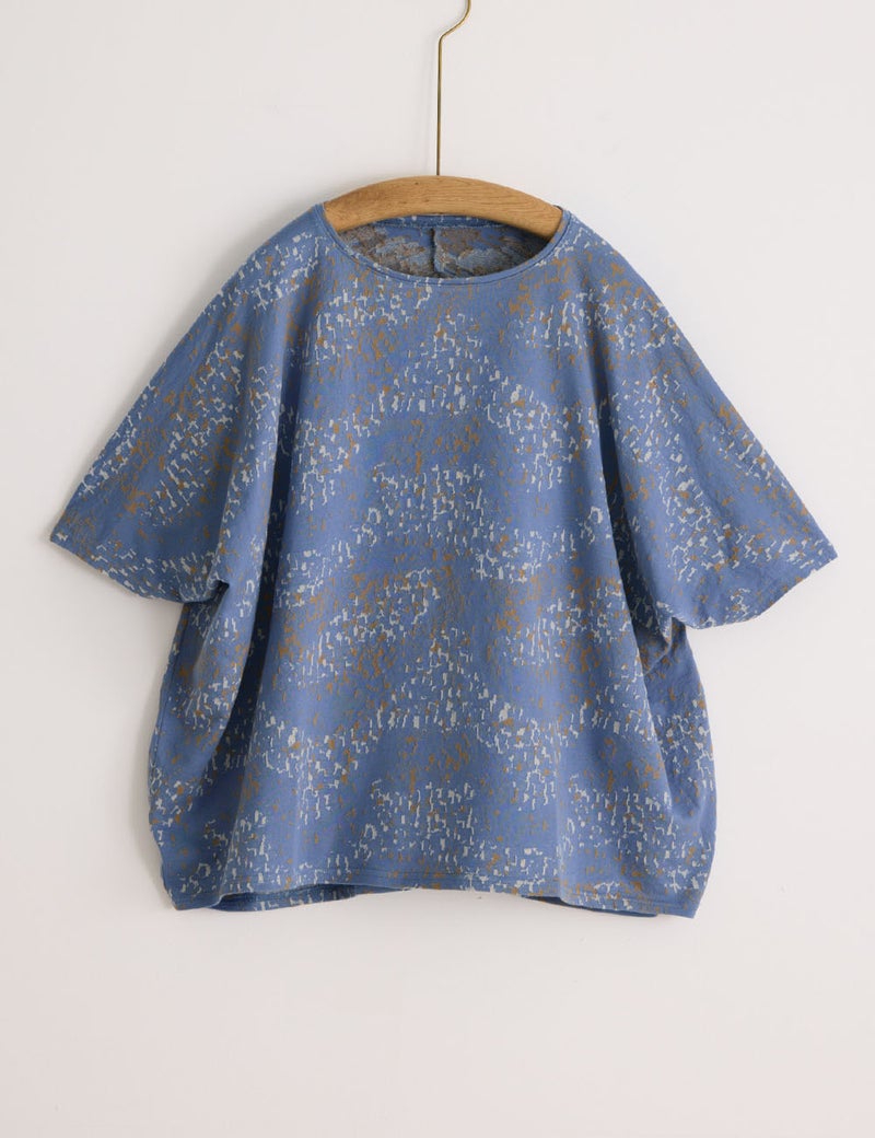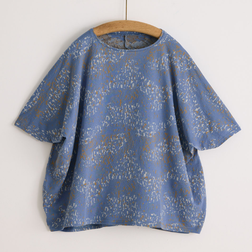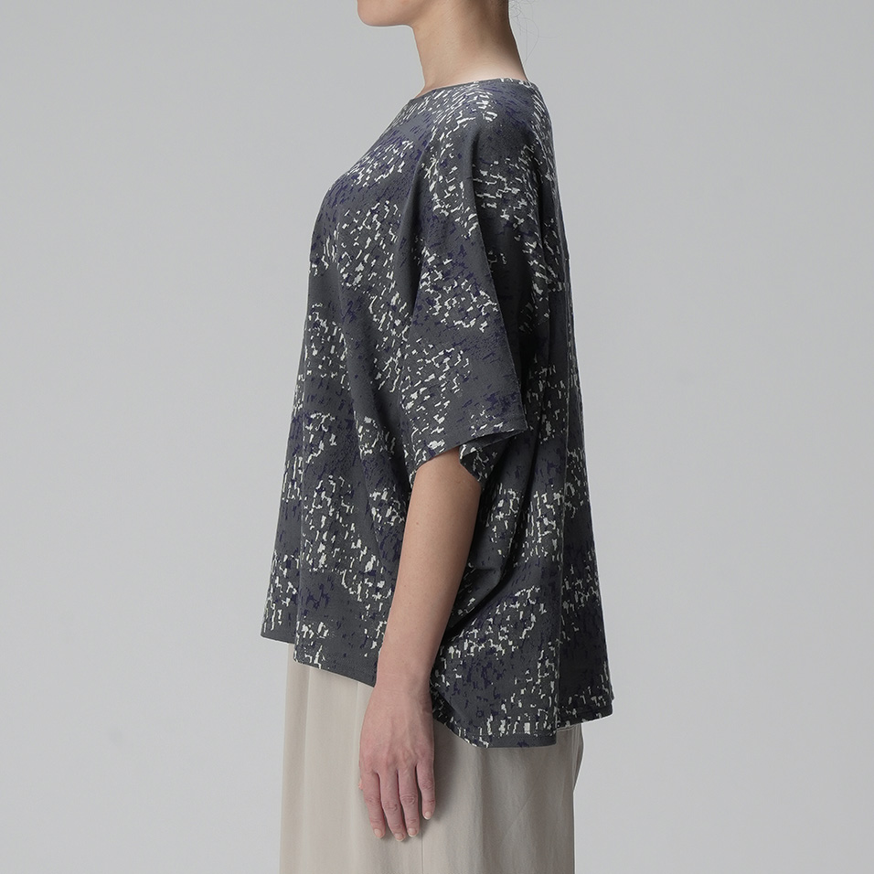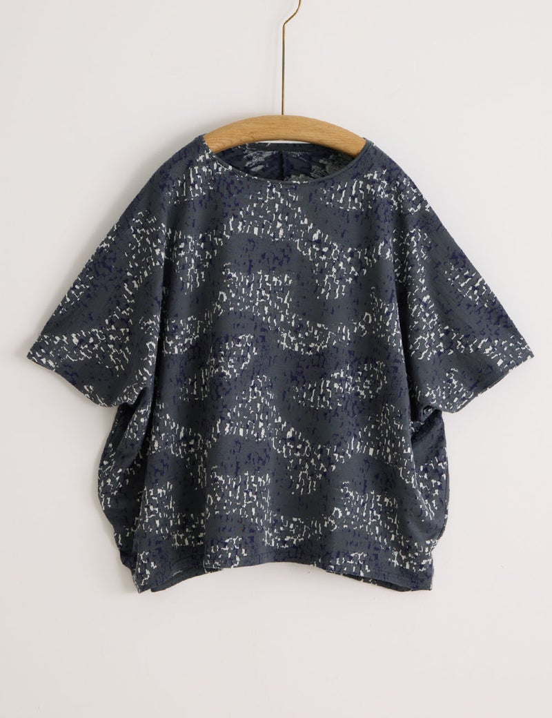 やわらかなカットソー生地を生かした、衣の中で体が自由に泳ぐようなワイドシルエット。揺らめくさざなみのような有機的な柄も美しく、春先には長袖インナーと重ね着して、ベスト風の着こなしも楽しめます。