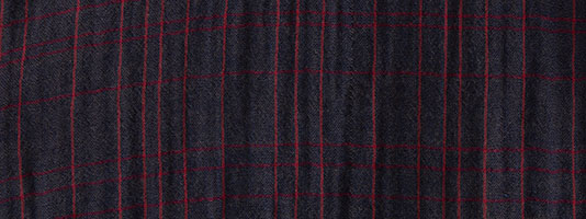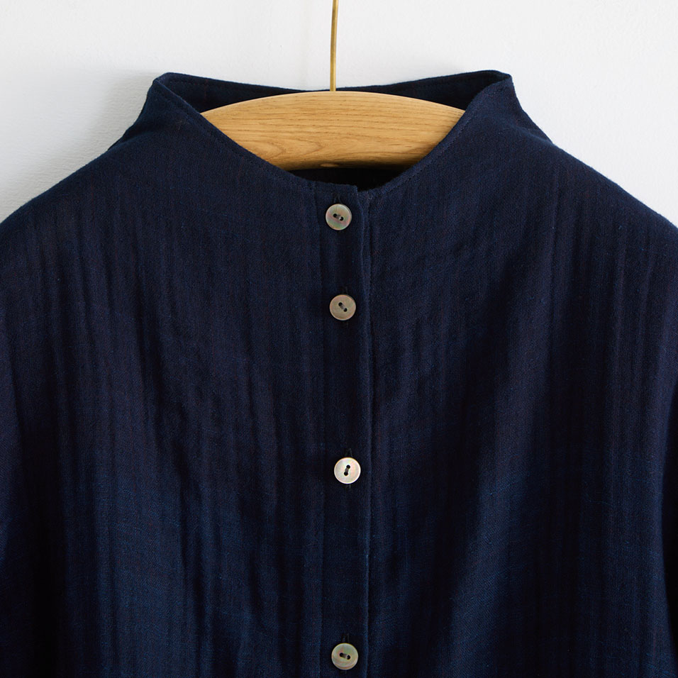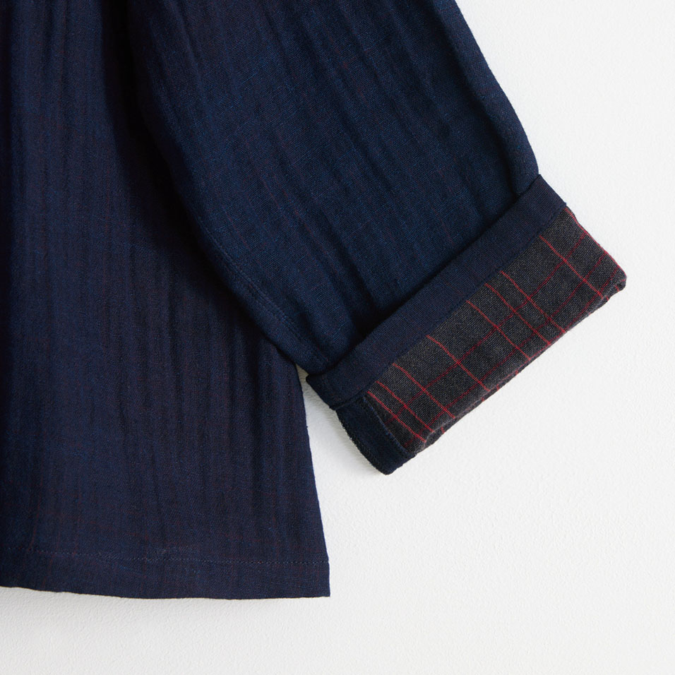 糸カセから藍染した二重織。ガーゼ状にあまく織り上げ、空気を含んだふわふわのやわらかな風合いに仕上がりました。素肌にも心地よい優しい風合いが魅力です。表は無地で裏側はチェック柄。ボタンを開けたり袖を折り返しても楽しい素材です。