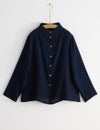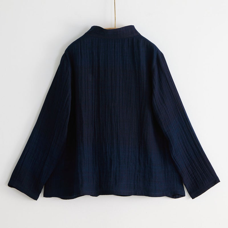 ふわふわやわらかな二重ガーゼの藍染ブラウス。インナーと重ねて羽織りとしたり、長い季節を着回せる前あきタイプです。袖口は2つ折り返すとチェック柄が見えます。夏の羽織りとしても便利なアイテムです。
