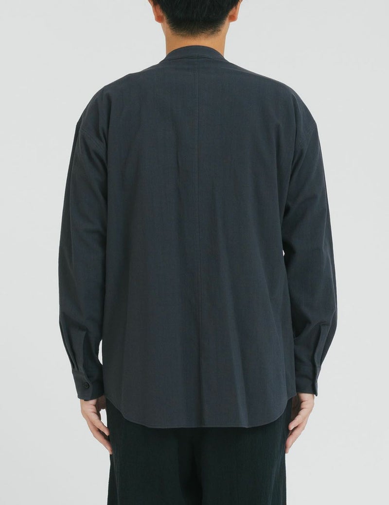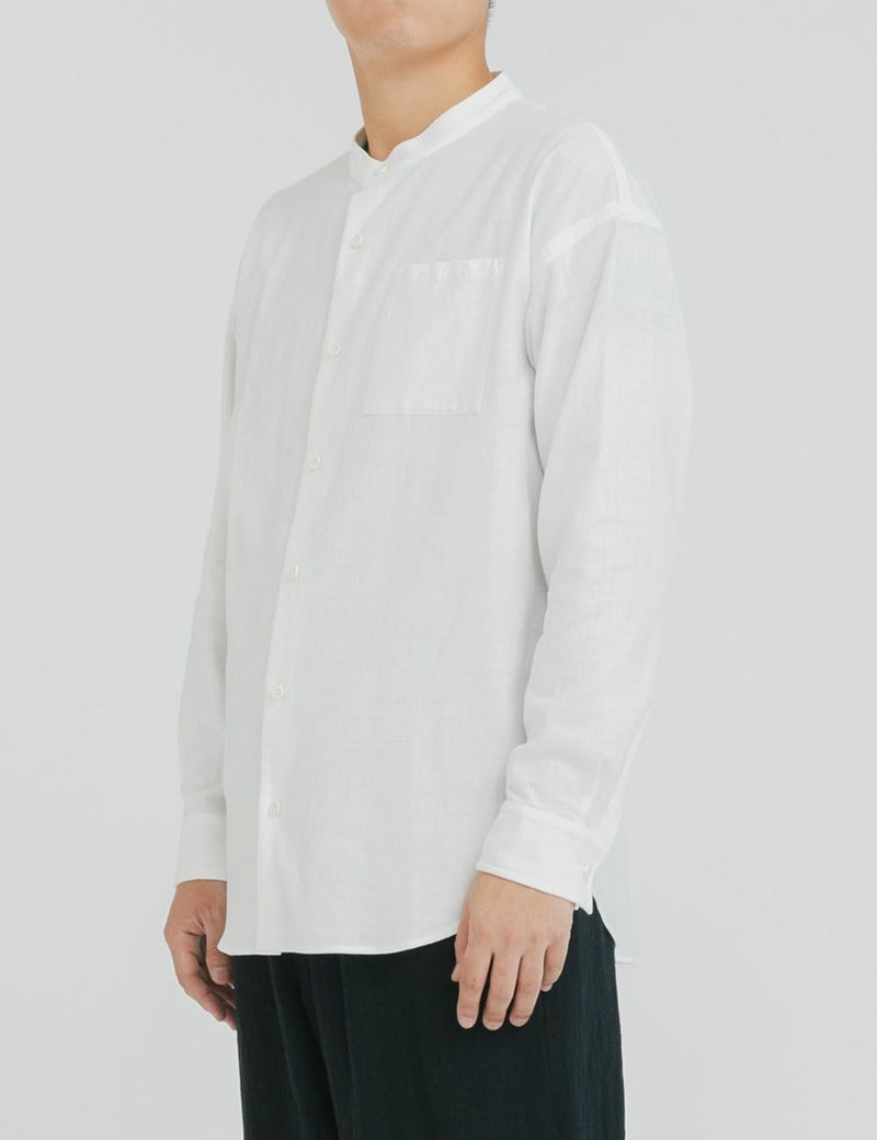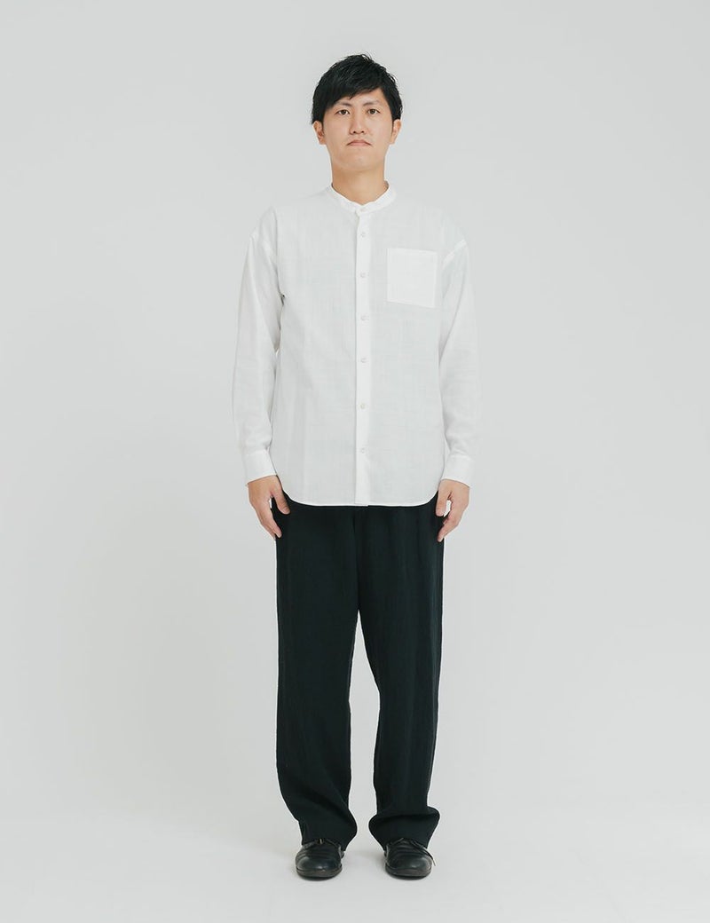 手紡ぎのような風合いを持つ「逆スラブ糸」を織り上げてバンドカラーシャツに。味わい豊かな織りが、シンプルな白シャツ姿を格上げしてくれます。M・Lの2サイズが揃って、女性がオーバーサイズで羽織っても素敵です。