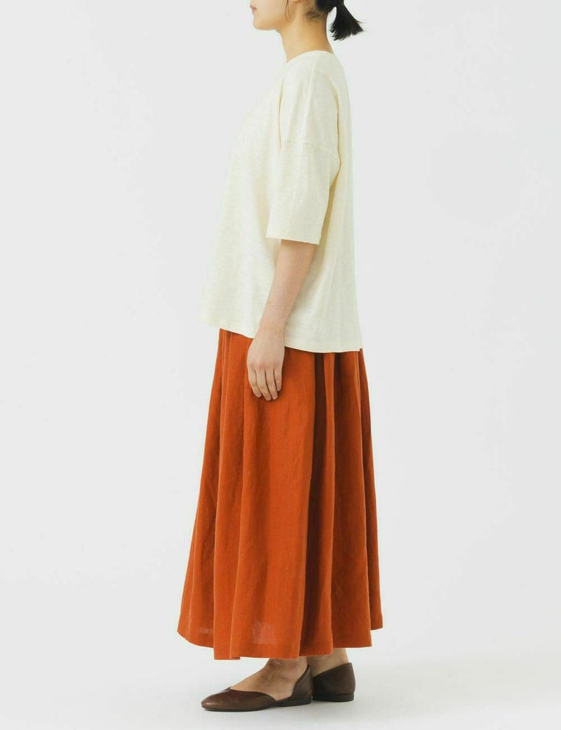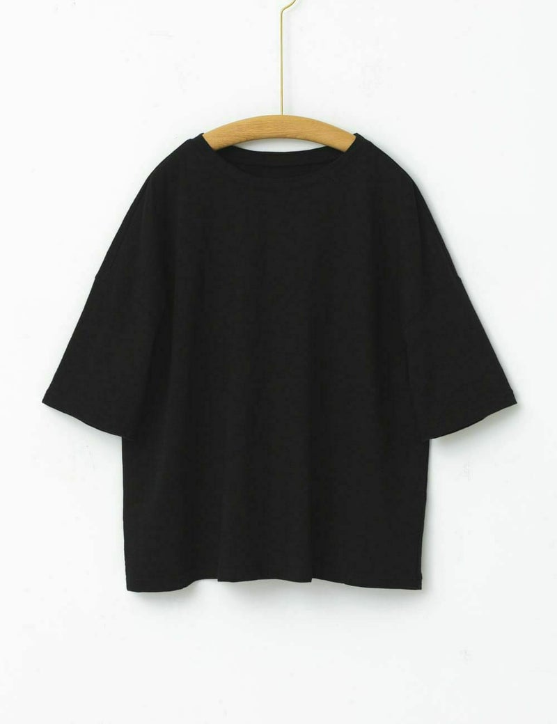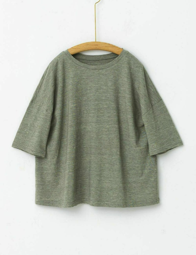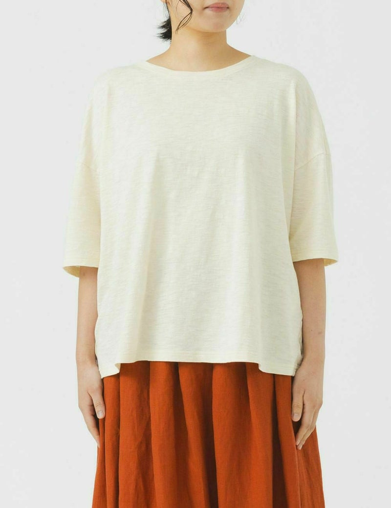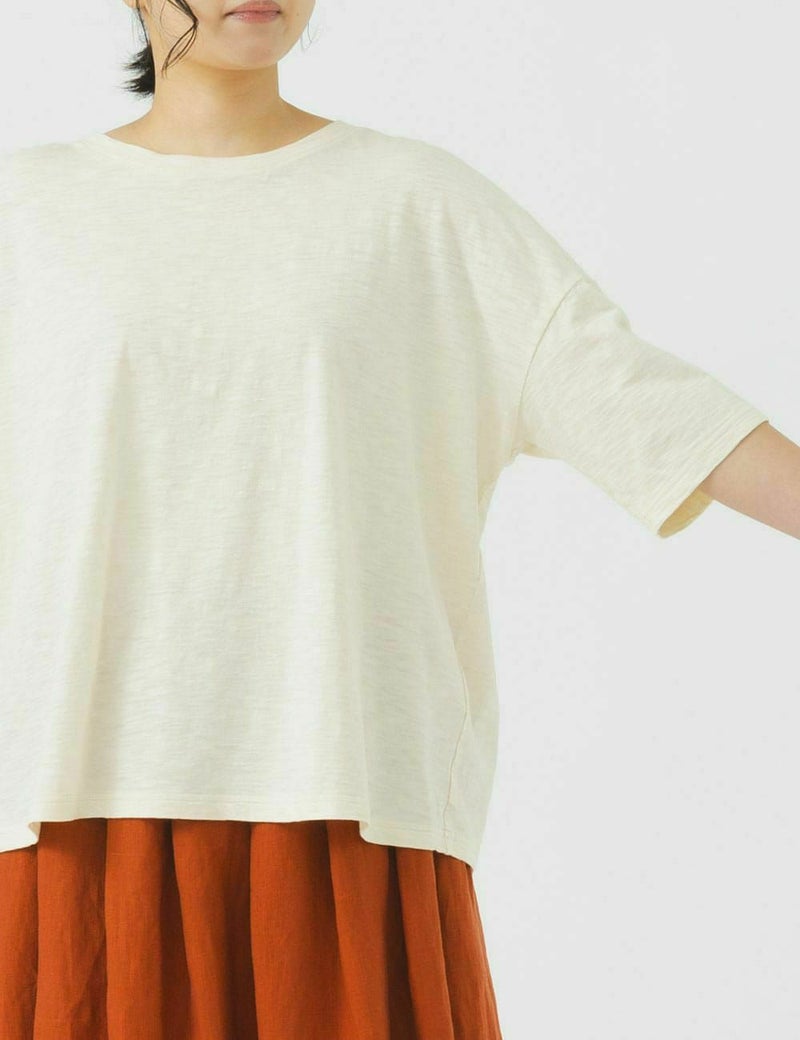身体のラインを拾わない、ゆったりとした着心地のシンプルなTシャツです。オーガニックコットンの色違いの糸で編んだ独特の深みがあり、カジュアルすぎない大人っぽい雰囲気をお楽しみいただけます。