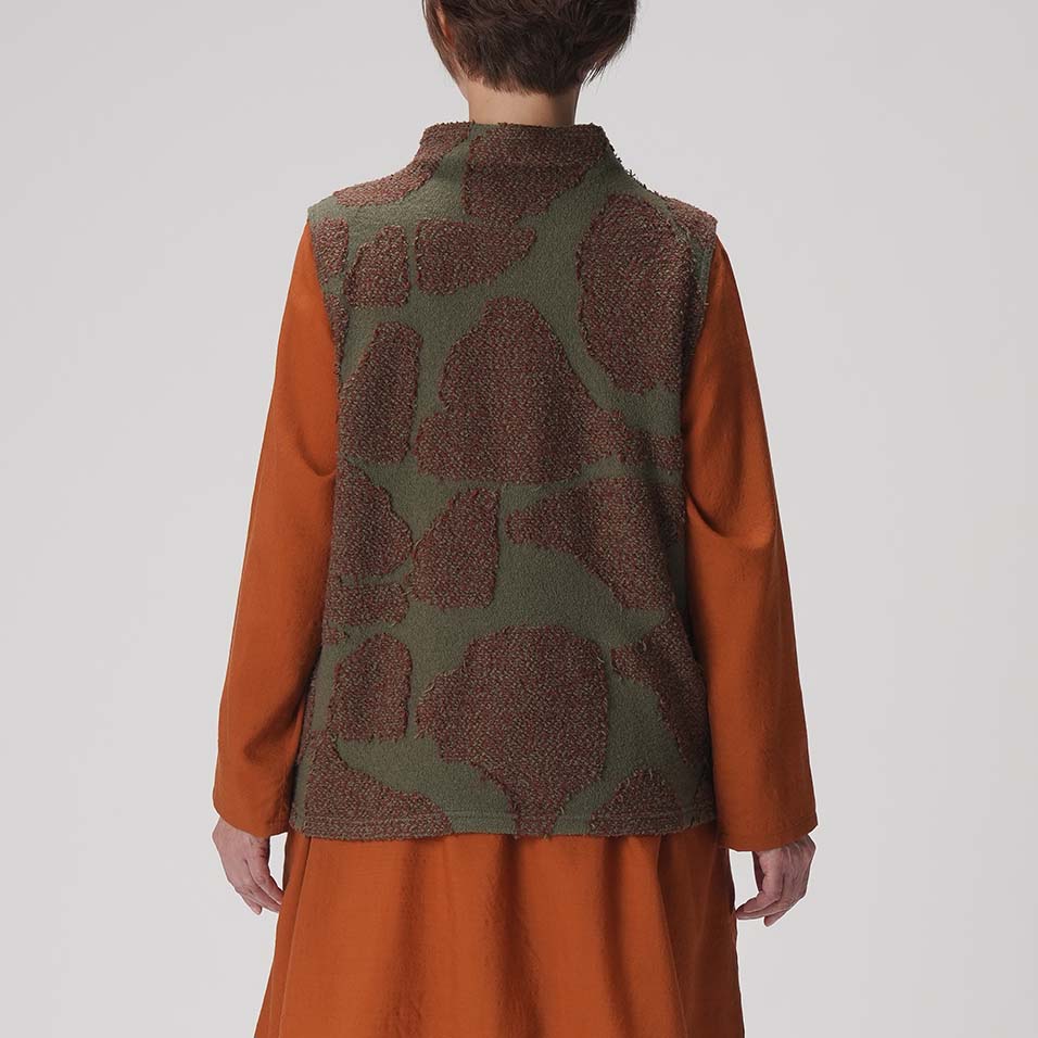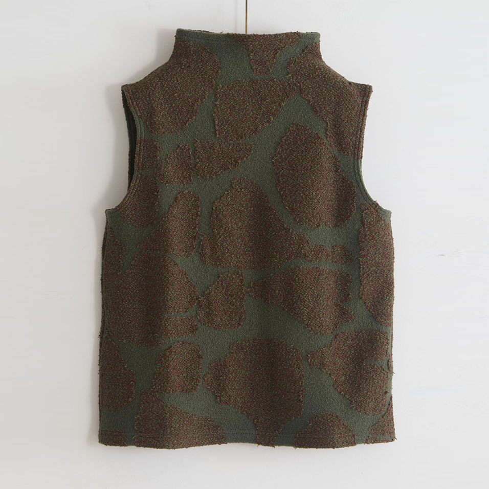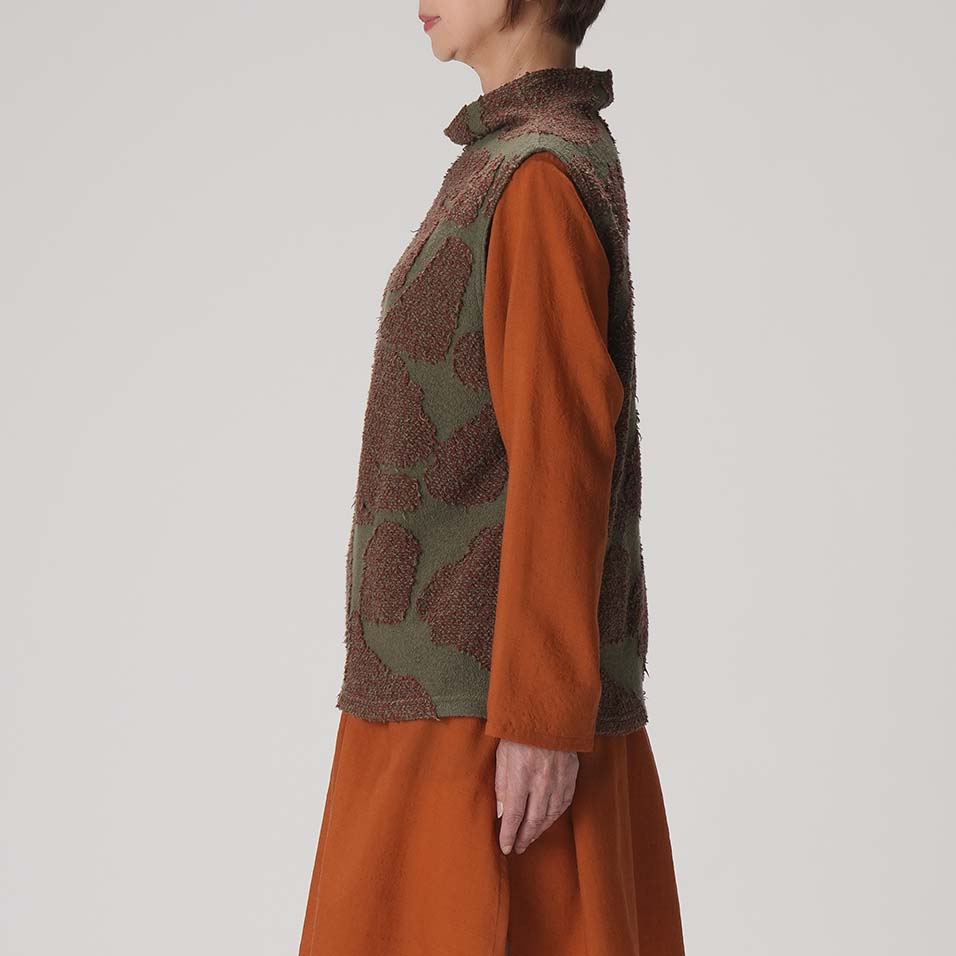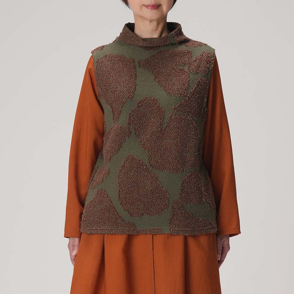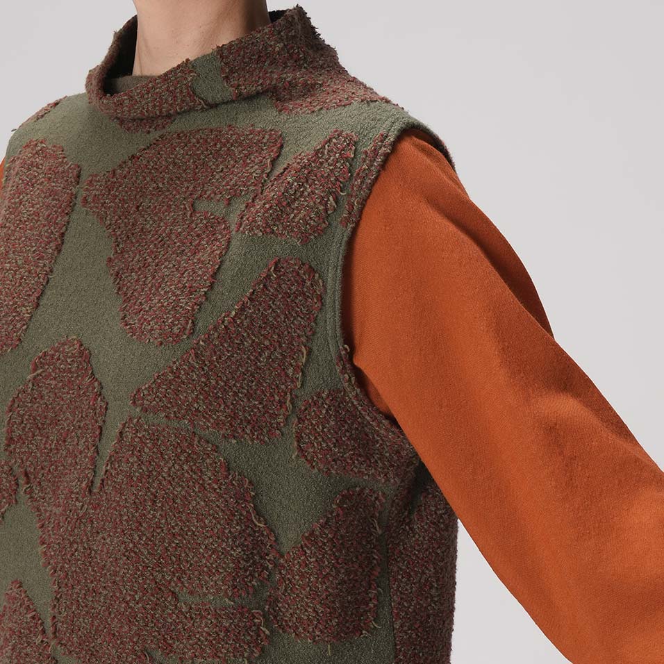 いちょうをイメージした柄を大胆に浮かび上がらせたジャガードニットのベスト。カット糸の表情が豊かで、シンプルなコーディネートもたちまちおしゃれ上級者の着こなしに。心地よいあたたかさが広がる、センスの足し算をお楽しみください。