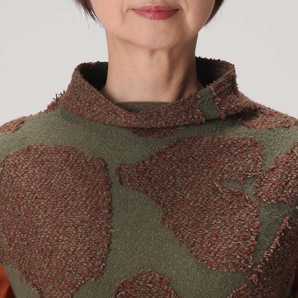 切り紙でつくったいちょうの葉を、パズルのように並べて作成した図案を、ニットジャガードで表現。ウールに綿の意匠糸2色を編み込み、湯洗いにかけることでウールを縮ませて、柄部分のカット糸の表情を豊かに浮き上がらせました。ソフトなふくらみのあるしなやかな風合いです。