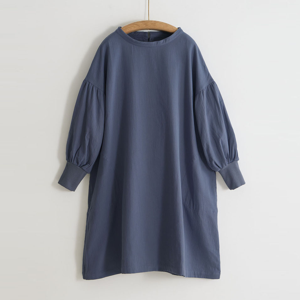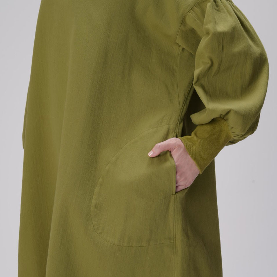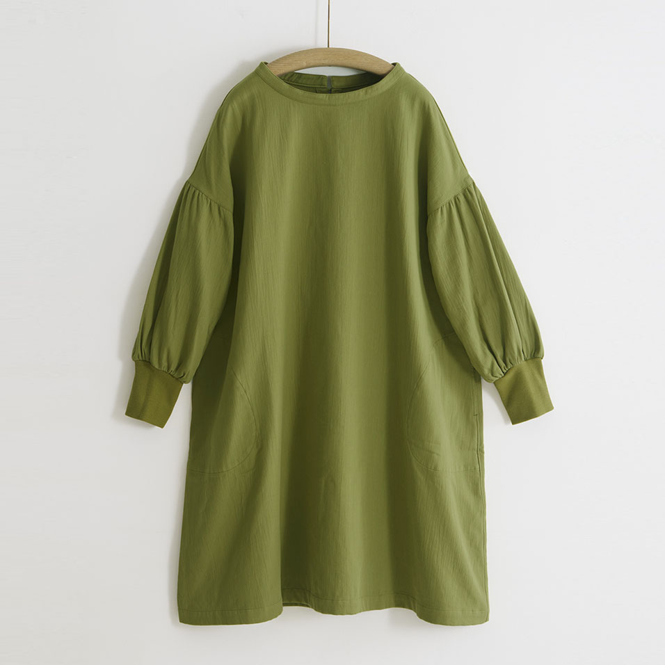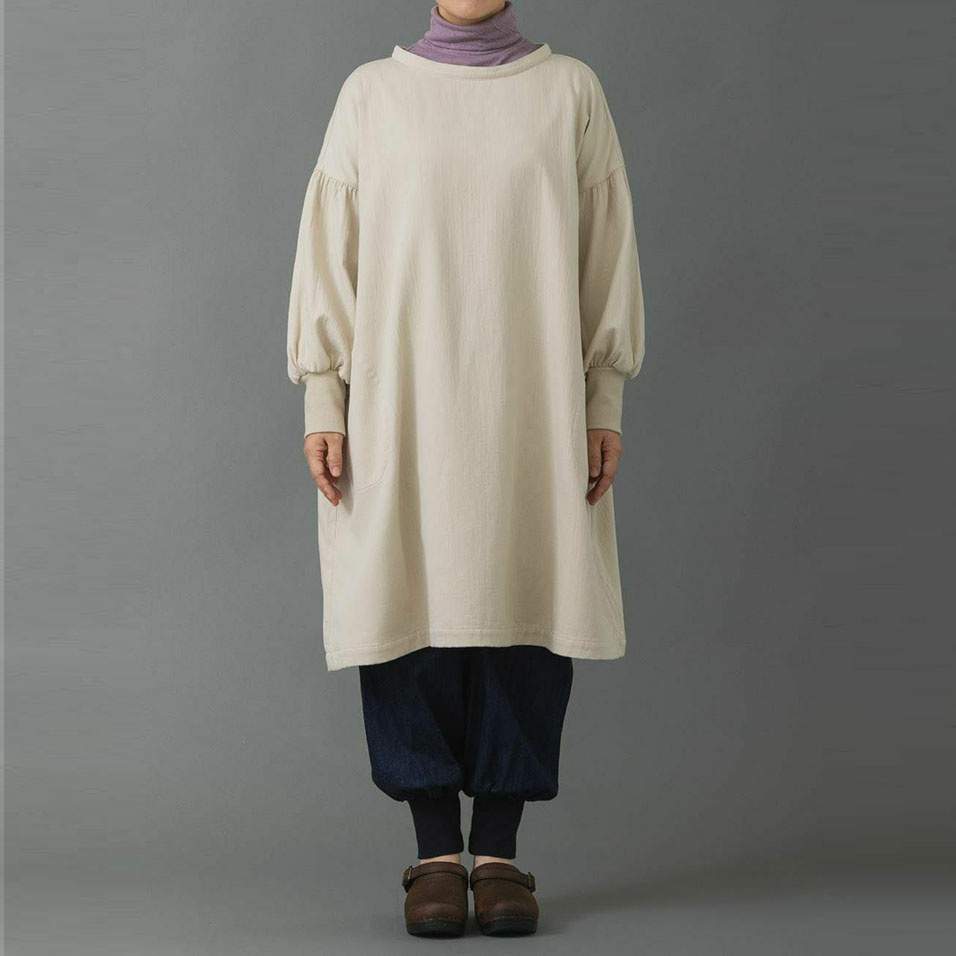 かっぽう着の頼もしさに、ワンマイルウェアとしてのおしゃれ心をプラスした定番ワークワンピース。二重織ツイルのほどよい厚みとやわらかさも人気です。セーターの上からでも重ね着できるたっぷりシルエットで、寒い朝もこれがあればやる気が出そう。