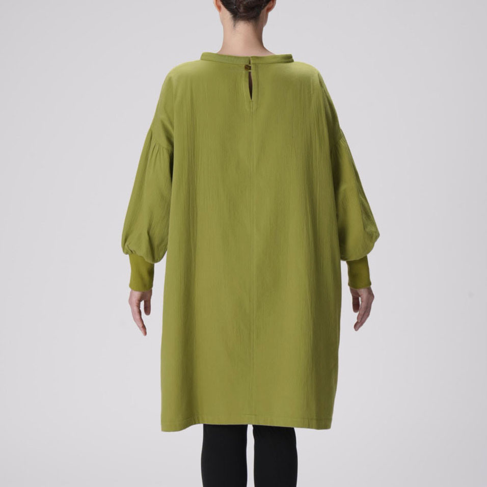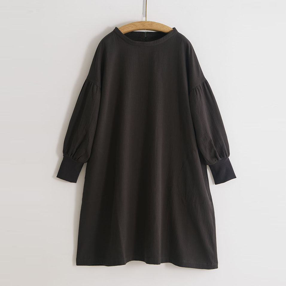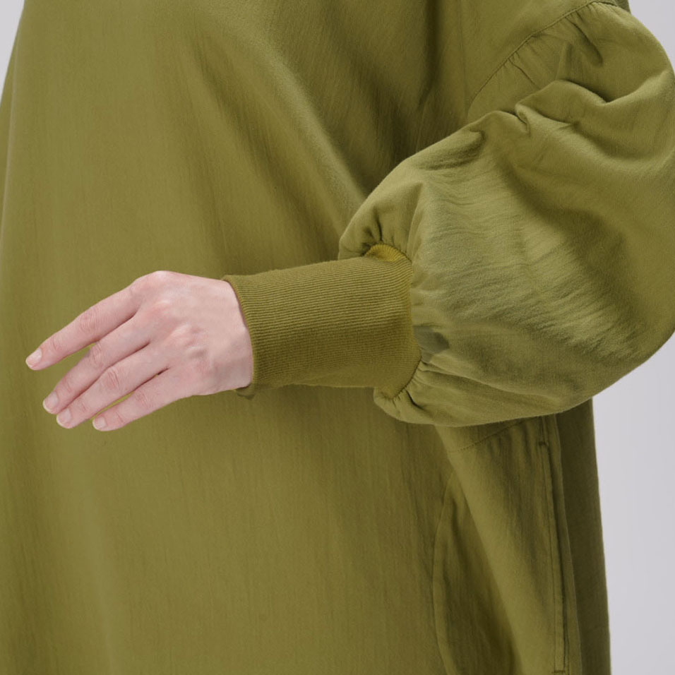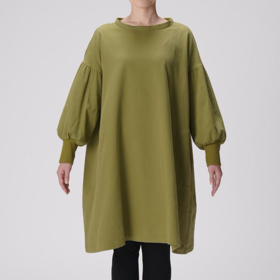 かっぽう着の頼もしさに、ワンマイルウェアとしてのおしゃれ心をプラスした定番ワークワンピース。二重織ツイルのほどよい厚みとやわらかさも人気です。セーターの上からでも重ね着できるたっぷりシルエットで、寒い朝もこれがあればやる気が出そう。