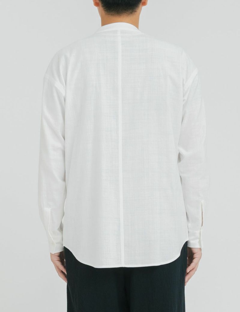 手紡ぎのような風合いを持つ「逆スラブ糸」を織り上げてバンドカラーシャツに。味わい豊かな織りが、シンプルな白シャツ姿を格上げしてくれます。M・Lの2サイズが揃って、女性がオーバーサイズで羽織っても素敵です。