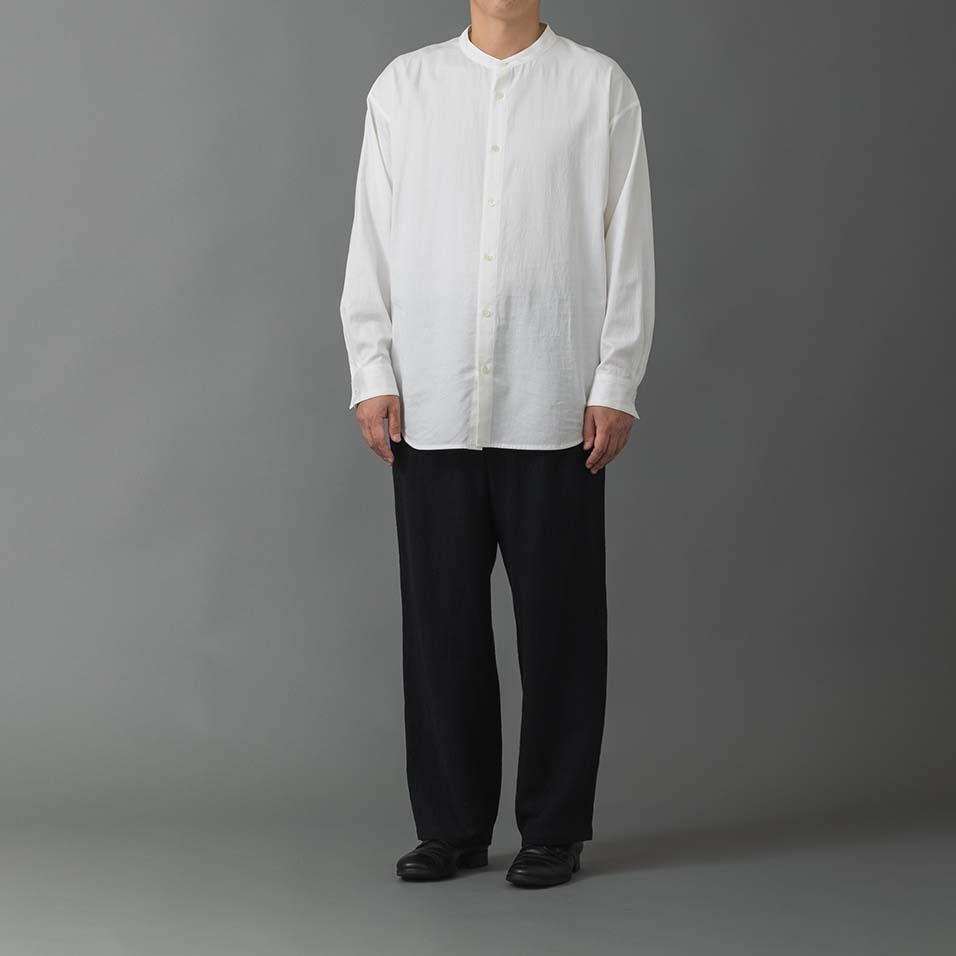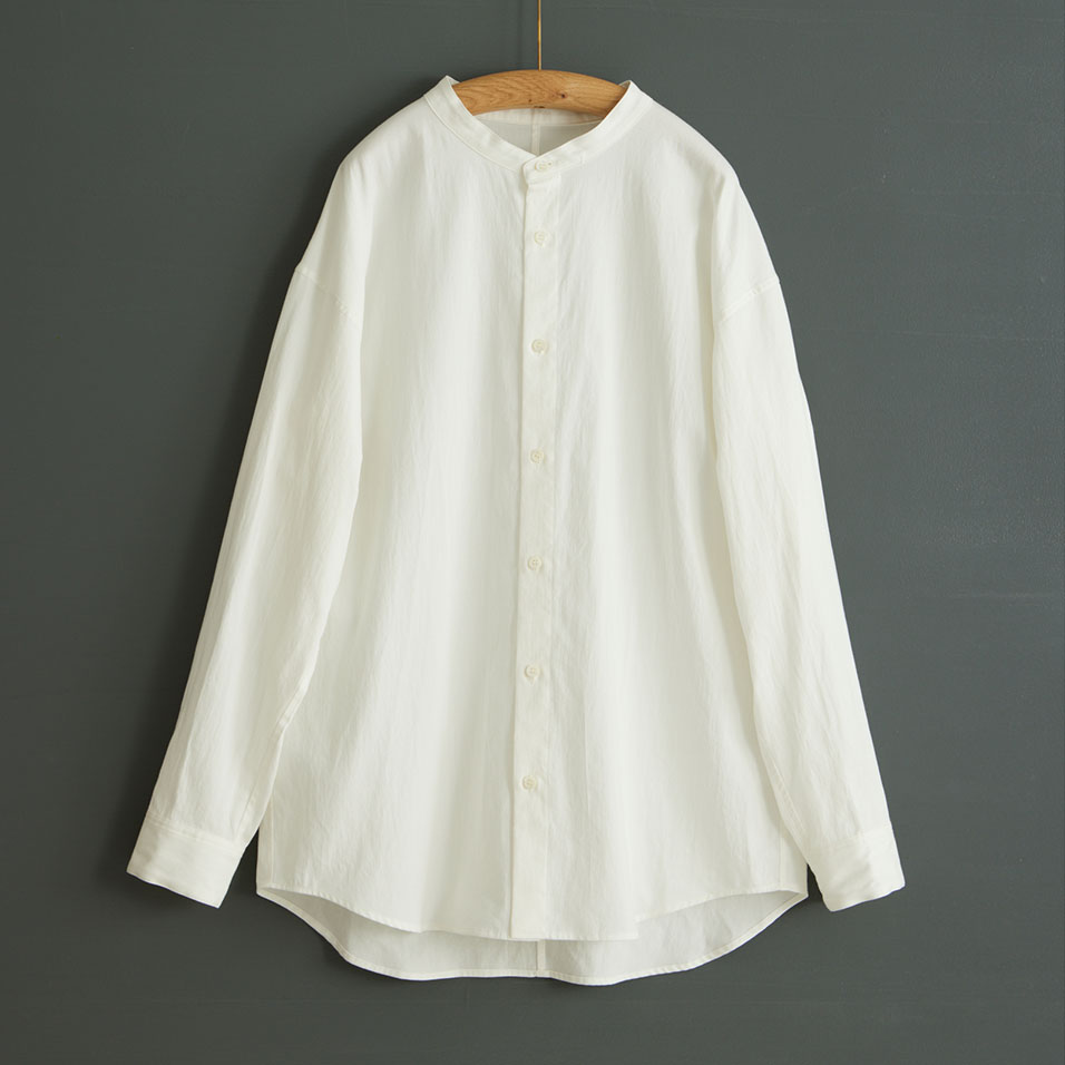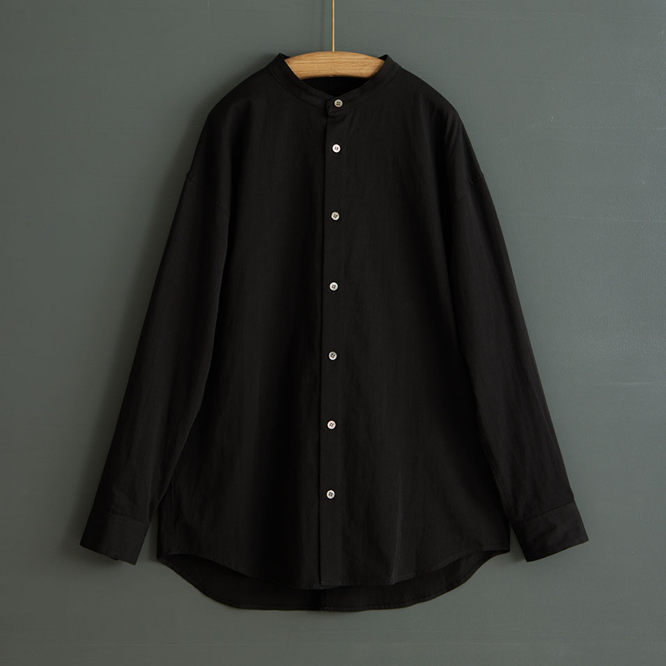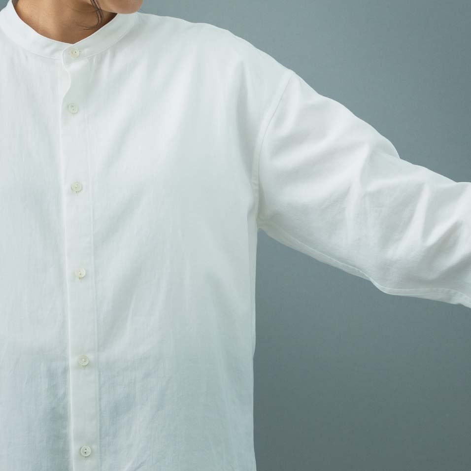 スタンドカラーのシャツで、女性が着ると品の良さとかっこ良さが感じられる、男性にも着ていただける仕立てです。肩はドロップしていて、上質なのにリラックス感のある着心地です。女性には、Sサイズがおすすめです。