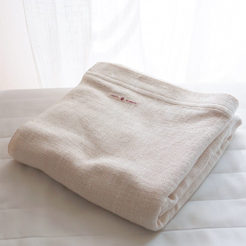 1日100gしか紡げない糸を使った和紡布のシングルサイズのシーツで、吸湿性と保温性にすぐれており、夏はさわやか、冬はあたたかく、1年を通して心地良く快適です。薄手のガーゼを重ねた、リバーシブルタイプのブランケットもございます。