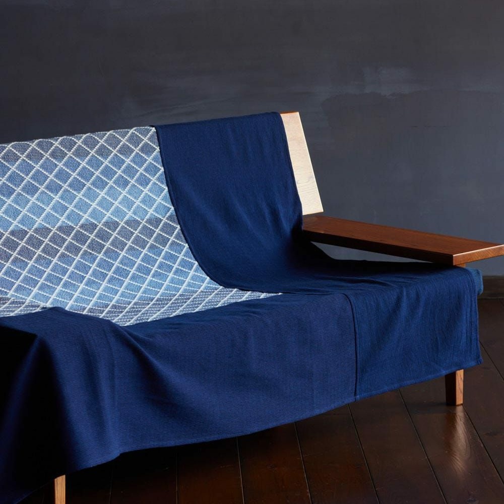 【 藍染め 】薄めの藍と白の糸で、菱形を立体的に表現。伝統的な「刺し子」を織物で再現した、職人技が光る生地です。別柄のマルチカバー、同じ柄や、濃いめの藍と白の糸で菱形にしたクッションカバーもありますので、チェックしてみてください。