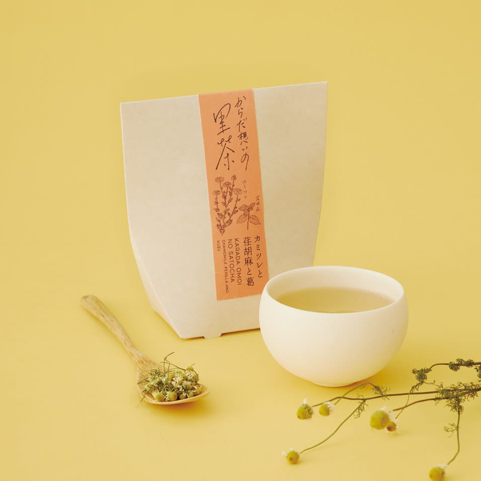 【 からだ想いの里茶 】里山の植物のちからで、からだや心をいたわるお茶のシリーズ。南阿蘇で無農薬栽培されたカミツレ(カモミール)のフレッシュな甘い香りに、葛や荏胡麻と生姜を加えました。不安定になりがちな女性のコンディションのためのお茶です。