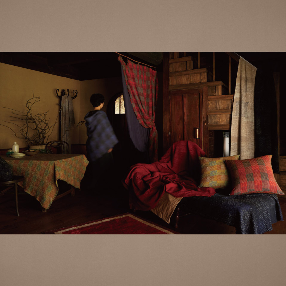 和更紗柄の端切れをパッチワークしたような生地に、刺し子調の糸目を施し、綿のやわらかさと保温性に麻の通気性とシャリ感が加わって、心地よく。尾州から届いた贅沢な織りをお楽しみください。