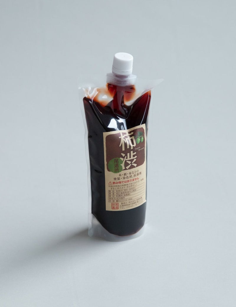 無農薬の青柿を数年かけ熟成し完成させた国産の柿渋の液です。江戸時代から農具や船の塗装、型紙の染料など幅広く使われてきた天然塗料・染料の力を手軽にお楽しみいただけます。木材やカゴに塗ったり、布を染めたりなど、時間を重ねるほどに深まる色合いが魅力です。