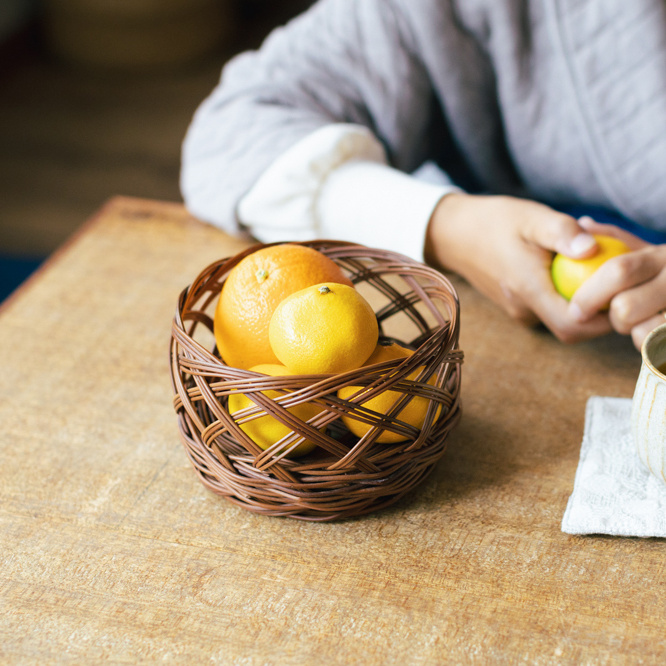 ミカンカゴ、ですが小物入れにもなったりできる便利なカゴです。「コシダ」という素材で、汚れても軽く洗うと取れるのでお手入れも簡単。底は素材をいくつも重ねて作っているため丈夫で、使うにつれて艶が増し、味わい深い色味になっていきます。