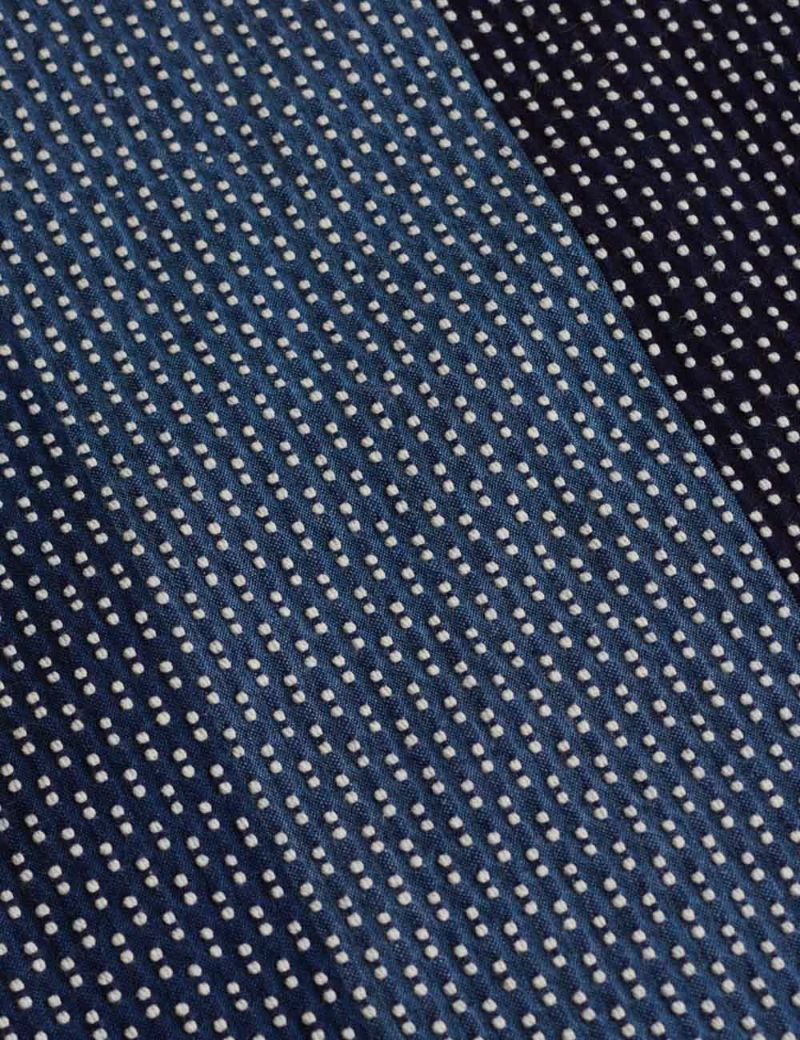 【 藍染め 】3色の藍の縞の上に、白い糸がポツポツとリズミカルに刺された柄で、モダンなイメージのお部屋にもよく似合いそう。伝統的な「刺し子」の雰囲気を織物で表現した、職人技が光る生地です。カバーのみでクッションは含みません。