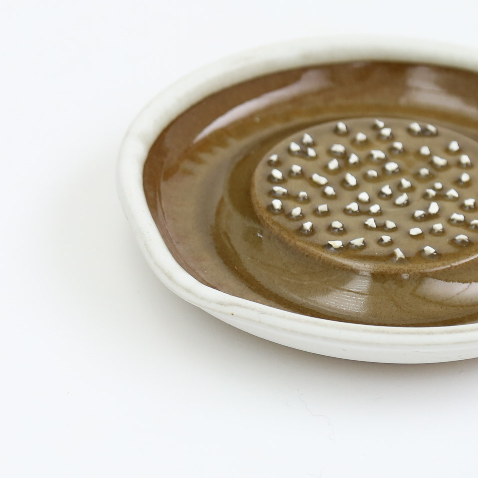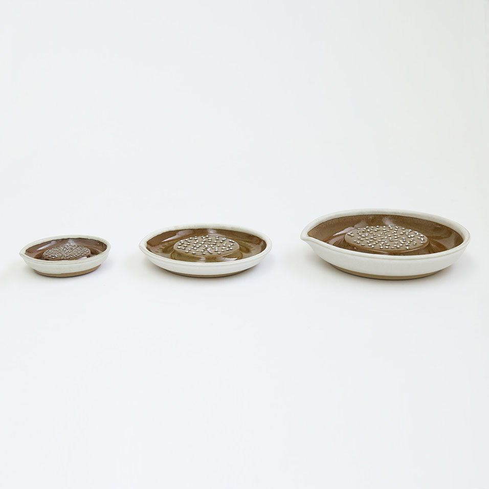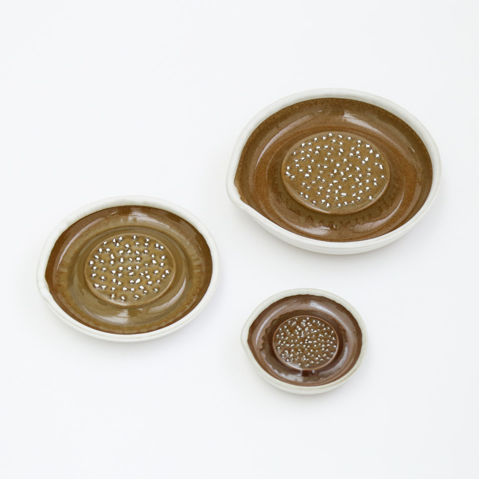 「大正14年創業の石見焼の窯元、「元重製陶所」。古くははんど(水がめ)や植木鉢など、常に生活に密着した『道具』を作ってきましたが、現在は作るものを「すり鉢」と「おろし器」のみに特化しています。直接口に入れるもののための陶器ですので、材料も100%安心安全なものを使用したり、すり味、おろし味に関係するために、職人の手作業にこだわるなどで、品質に自信を持っています。