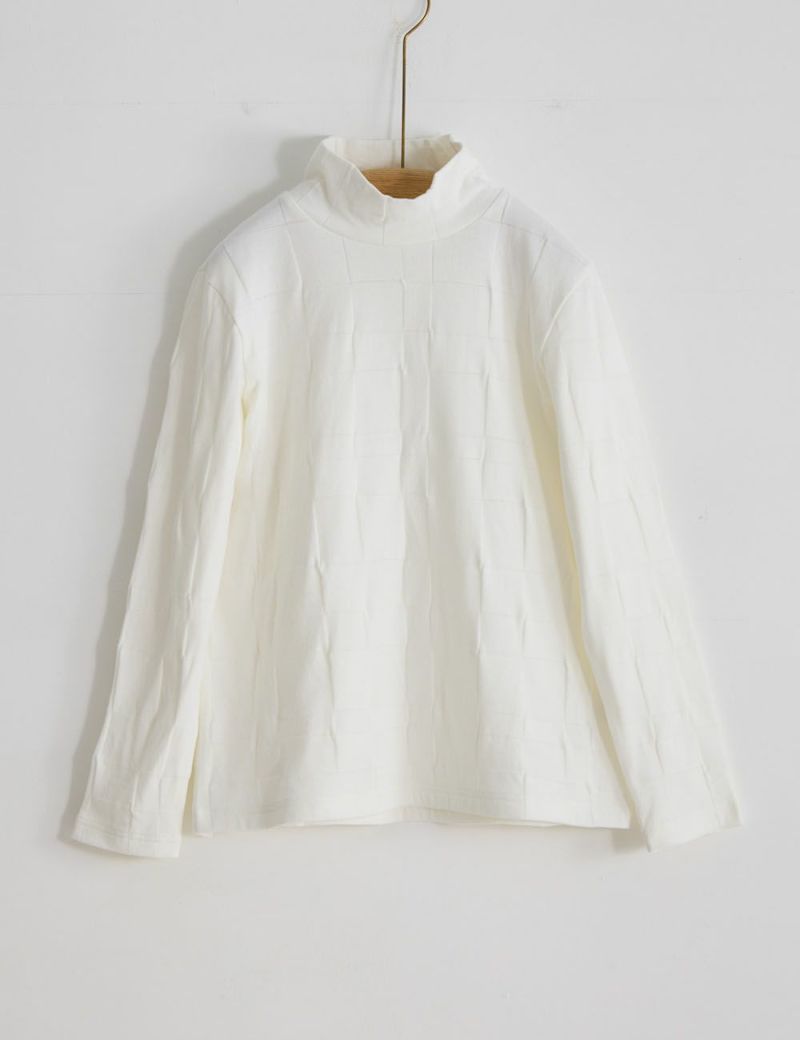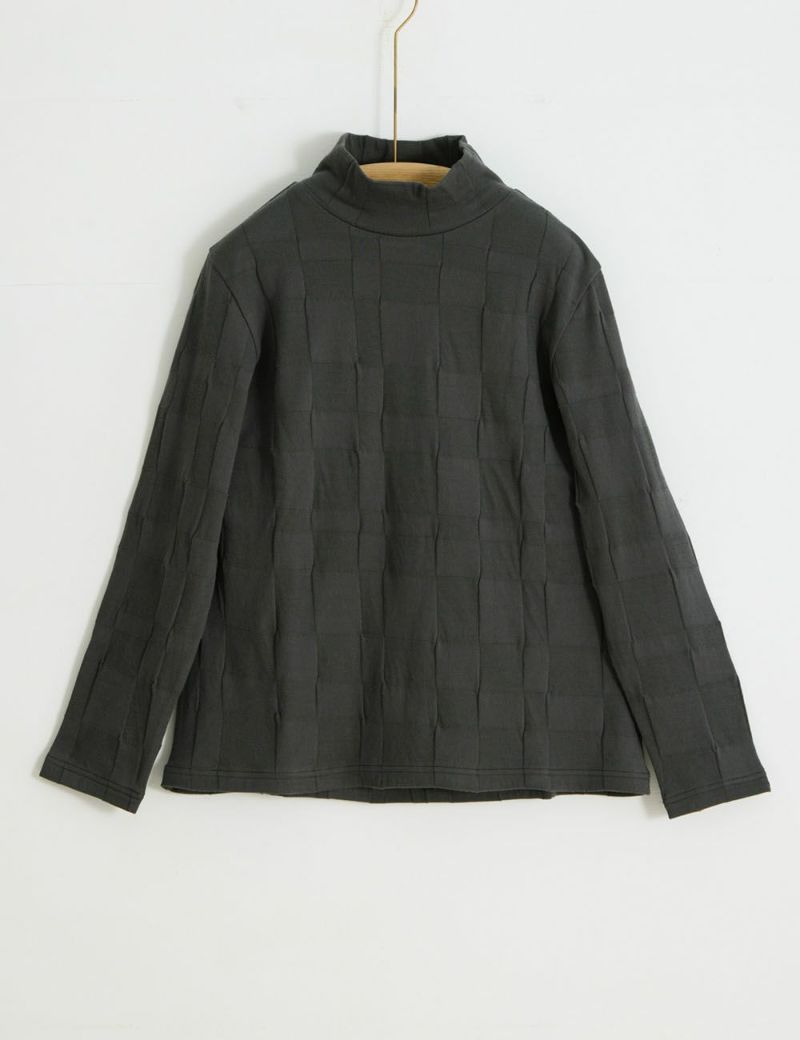 スムーズな肌ざわりの二重編み生地で仕立てたハイネックカットソー。ほどよくコシのある生地は、一枚でさらりと着ても肌につかず離れず、きれいな着姿をキープ。市松模様が醸し出す陰影も美しく、着るほどに布づくりのこだわりが感じられます。