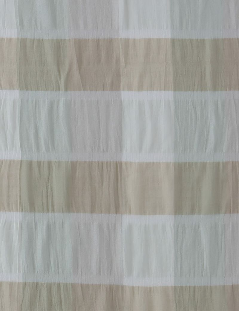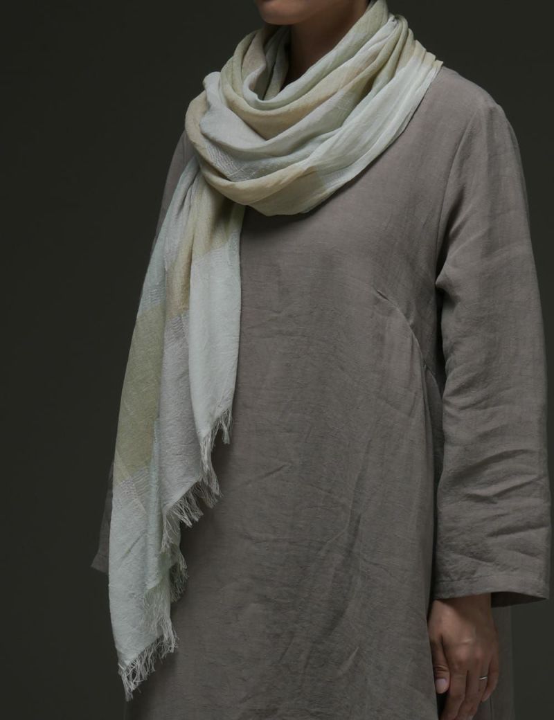 シルクのなめらかさと艶やかさに、綿と麻の自然な風合いをブレンドした薄手ストール。ブロックチェックに織り込まれた綿強撚糸の白ラインが縮絨(しゅくじゅう)し、生地表面に波打つような表情を与えています。無造作に巻くだけで美しく映える一枚です。