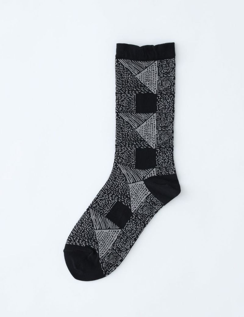 手刺しのステッチキルトを思わせるモチーフを、繊細な編み地で表現したソックス。やわらかな履き口のリブがもたらす、やさしいフィット感がクセになります。ちょっぴりひねりの効いた配色も、着こなしのスパイスになってくれそう。