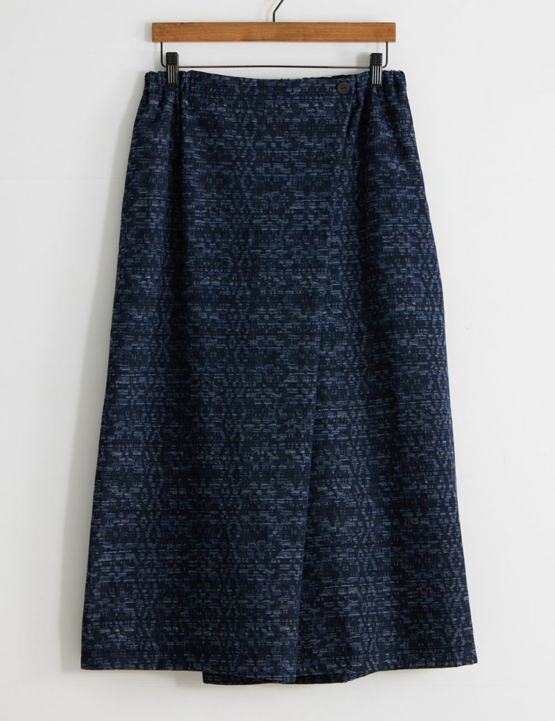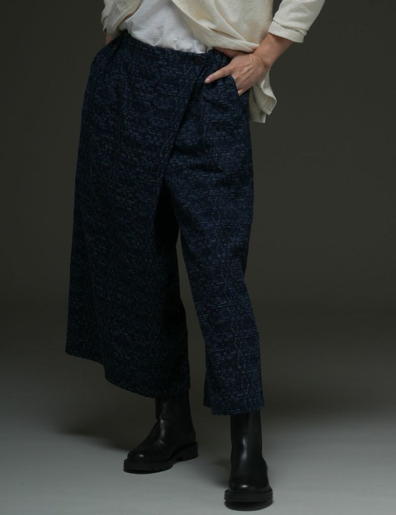 幾何学模様を絣のように浮かび上がらせたジャガード織が印象的な一着。スカート感覚で着こなせるラップパンツは、体型を問わずどなたにもよく似合います。長く付き合うほどに、美しいインディゴの濃淡が、自分だけの色合いに育っていくのも楽しみです。