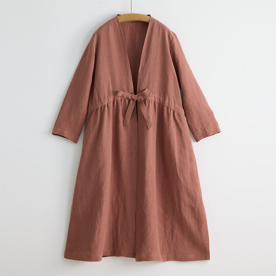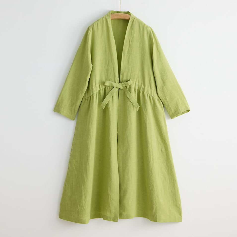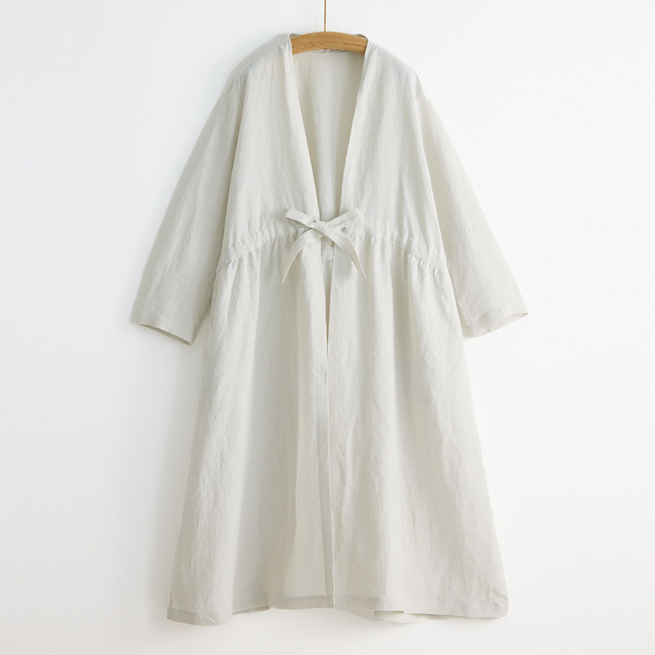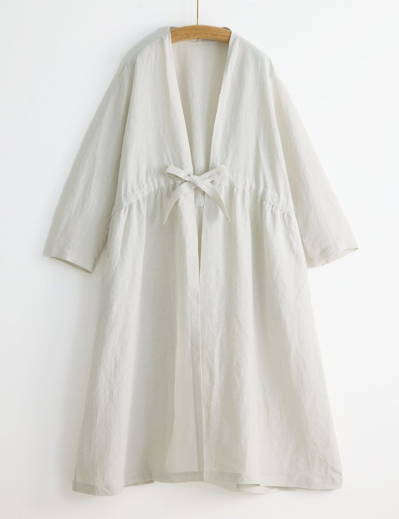 ニュアンス豊かな植物由来の色で染め上げた、洗いざらし風リネンをローブワンピースに。涼やかな着心地で、夏の紫外線対策や冷房よけにも役立ちます。ウエストの幅広リボンでお好みのシルエットに調節して、ほんのりドレッシーな着こなしをお楽しみください。