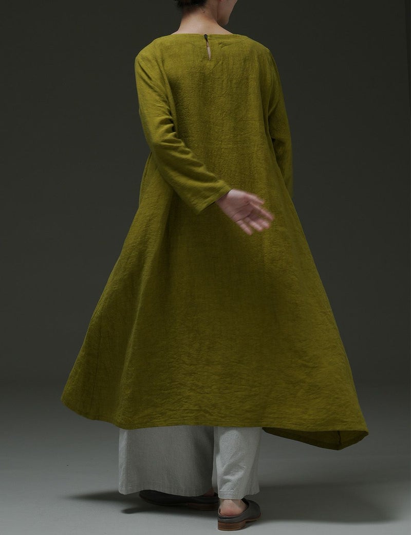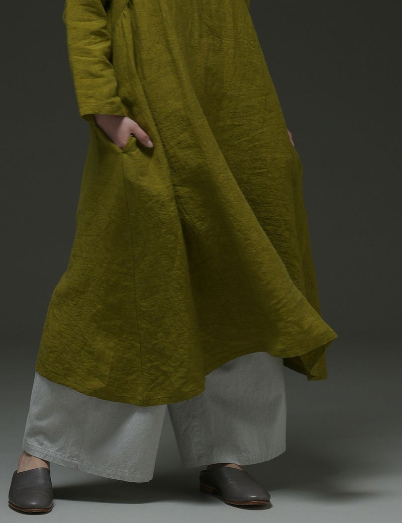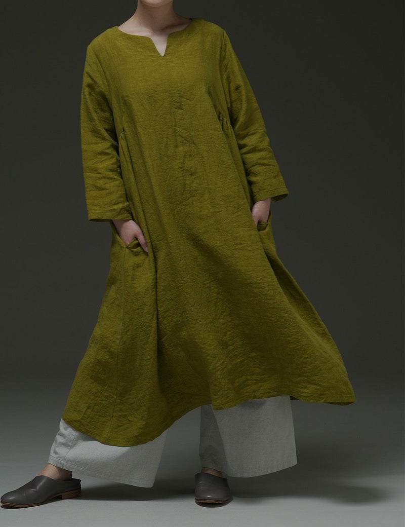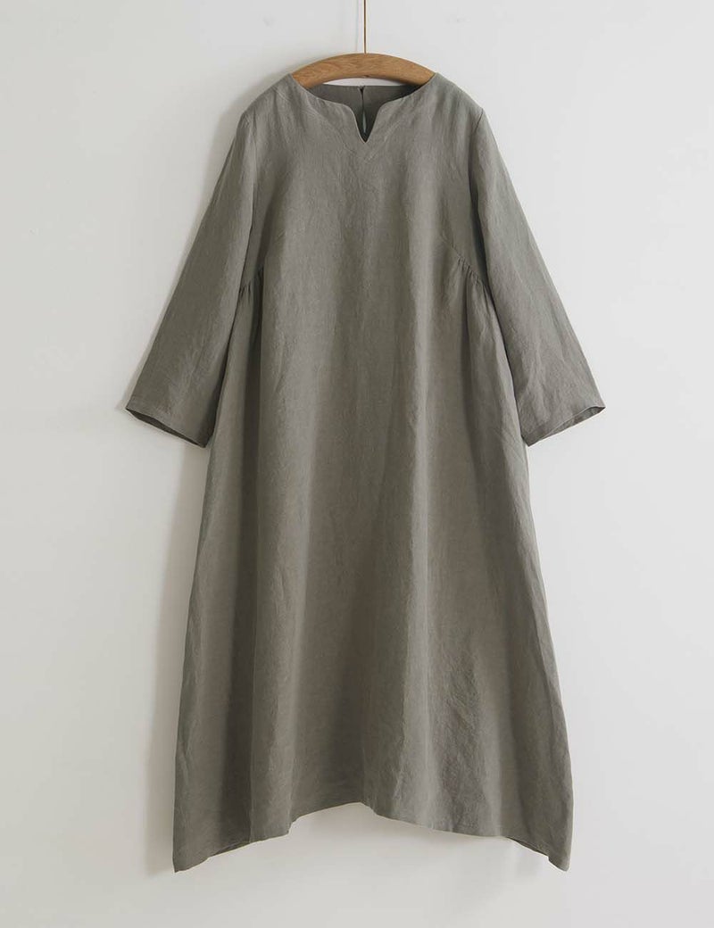 里山に息づく植物からもらった、味わい深い色を楽しむ麻ワンピース。首元を華奢にすっきり見せるスキッパー襟や、手首が見える八分袖、歩くたび揺れるドレープが、ヴィンテージ感漂うリネンと絶妙バランスを醸し出し、着る人を美しく包みます。