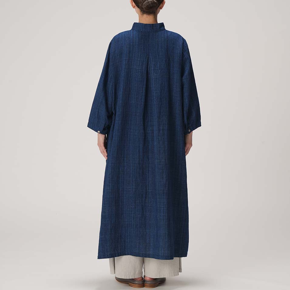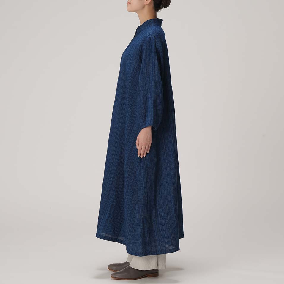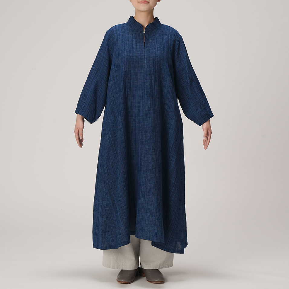 スタンドカラーがアクセントになったオリエンタルな気配漂うワンピース。みずみずしく繊細な藍の線が冴えわたる綿麻の雨絣生地がさらりと心地よく、季節の変わり目にもぴったり。一枚さらりとまとうだけで、芯のある美しさで着る人を包みます。