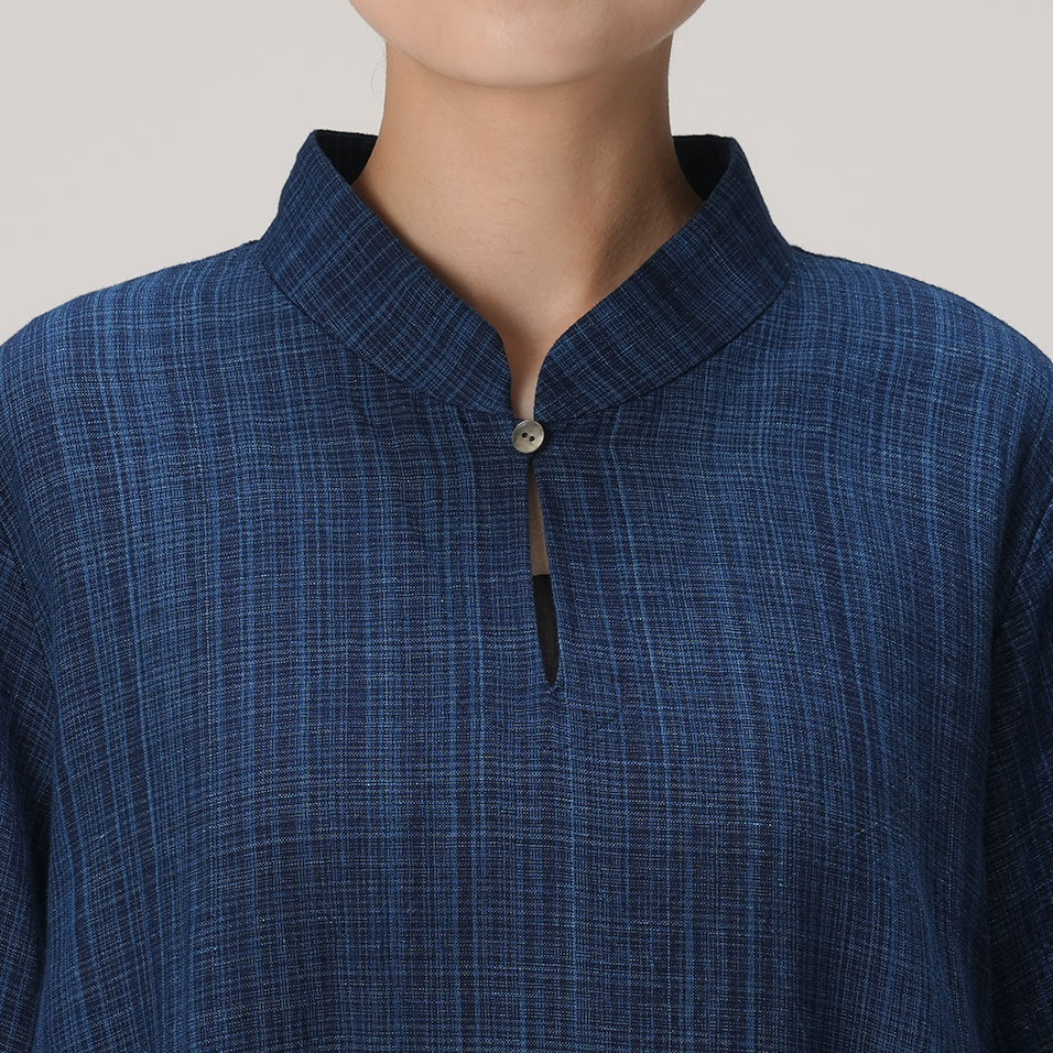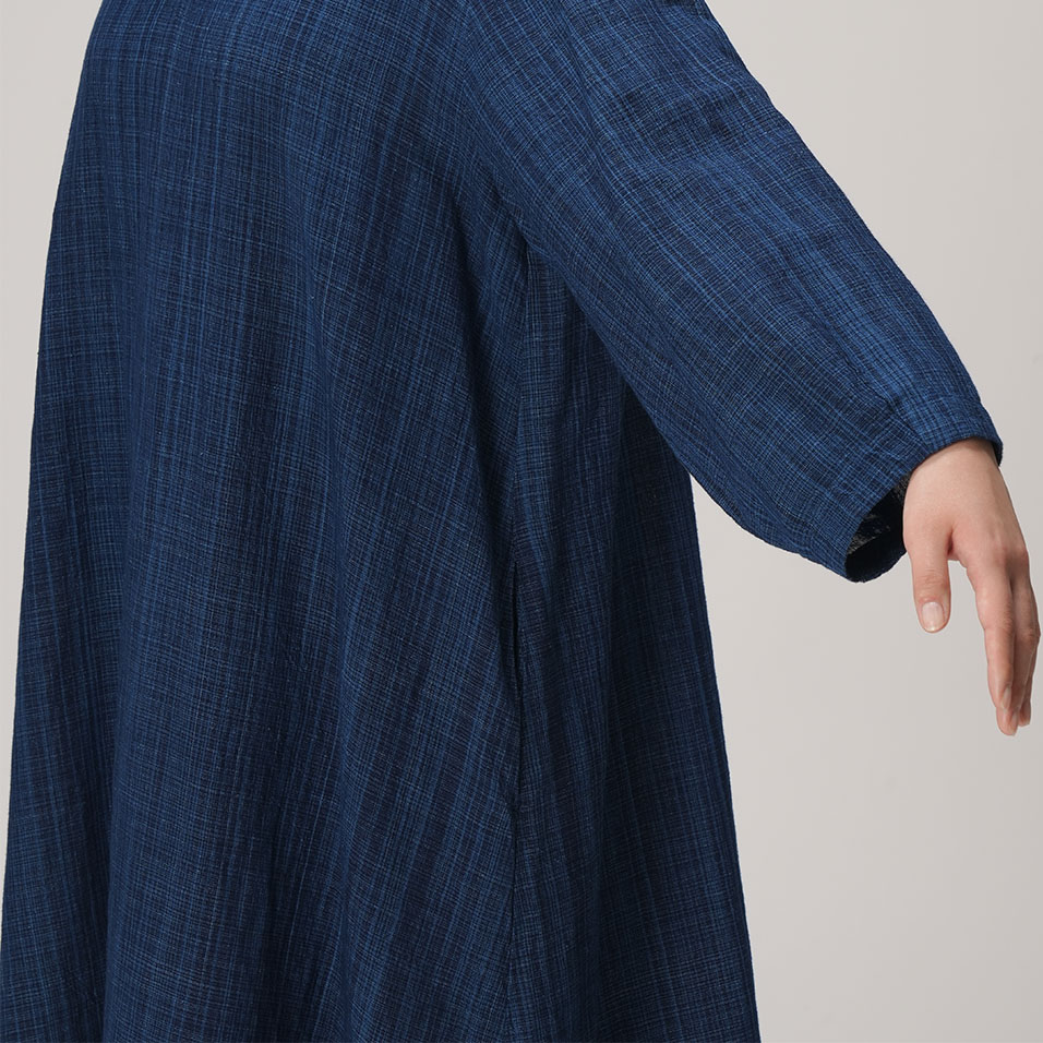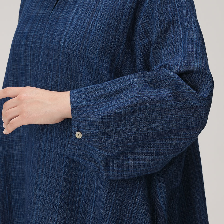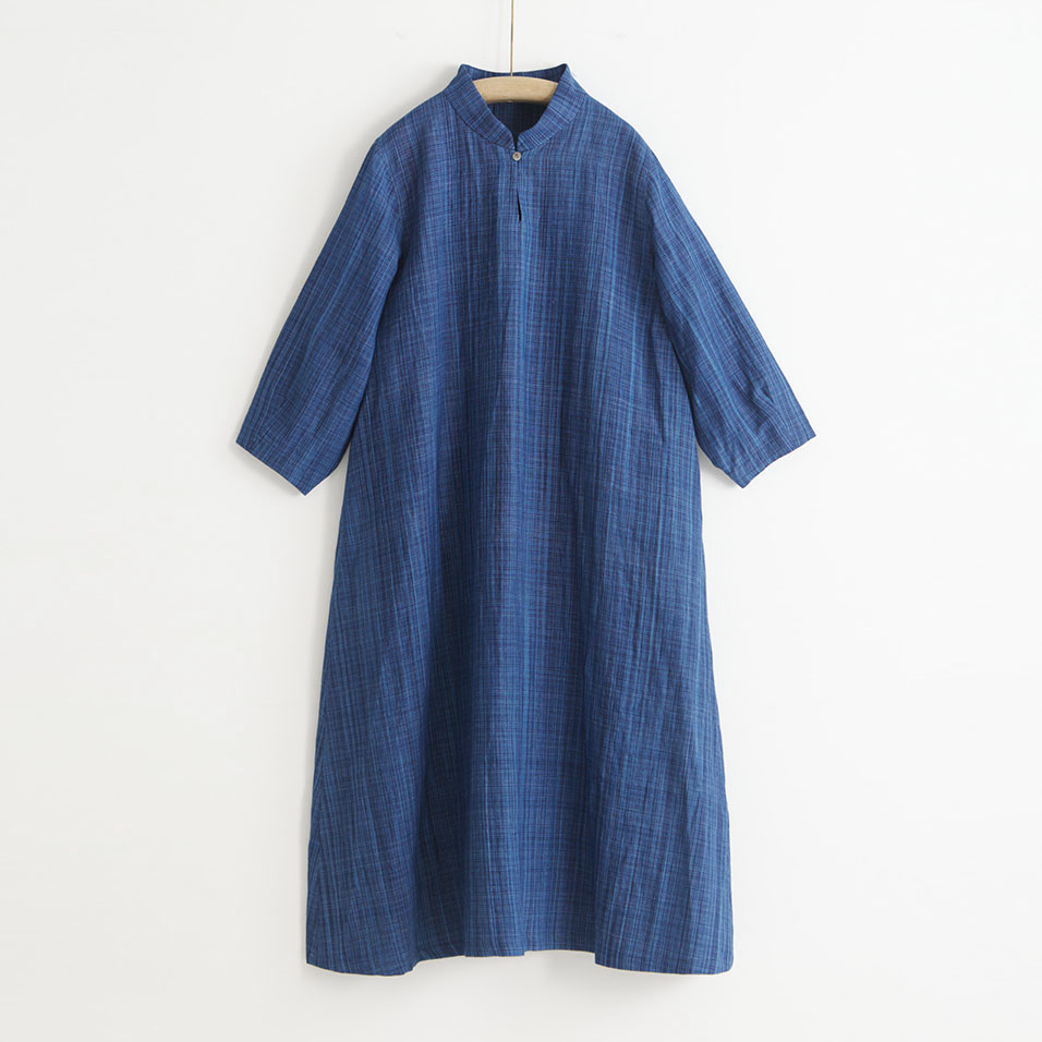 スタンドカラーがアクセントになったオリエンタルな気配漂うワンピース。みずみずしく繊細な藍の線が冴えわたる綿麻の雨絣生地がさらりと心地よく、季節の変わり目にもぴったり。一枚さらりとまとうだけで、芯のある美しさで着る人を包みます。