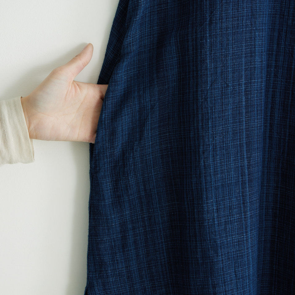 冴えた藍の濃淡が醸し出す、繊細なみじん格子のような表情。経糸(たていと)には絣染めした綿糸を、緯糸(よこいと)には濃淡2色の麻糸を使用して、ほのかな光沢とシャリ感のある風合いに織り上げました。長く付き合うほどに自分だけの色合いに育っていくのも楽しみです。