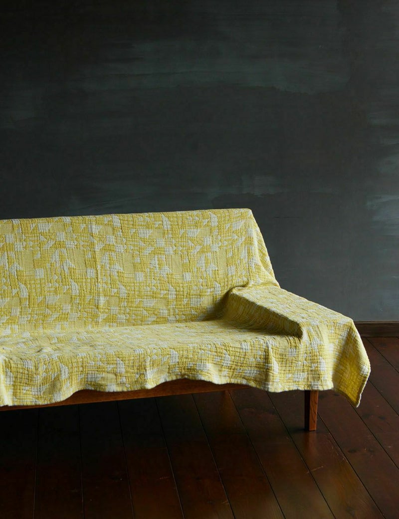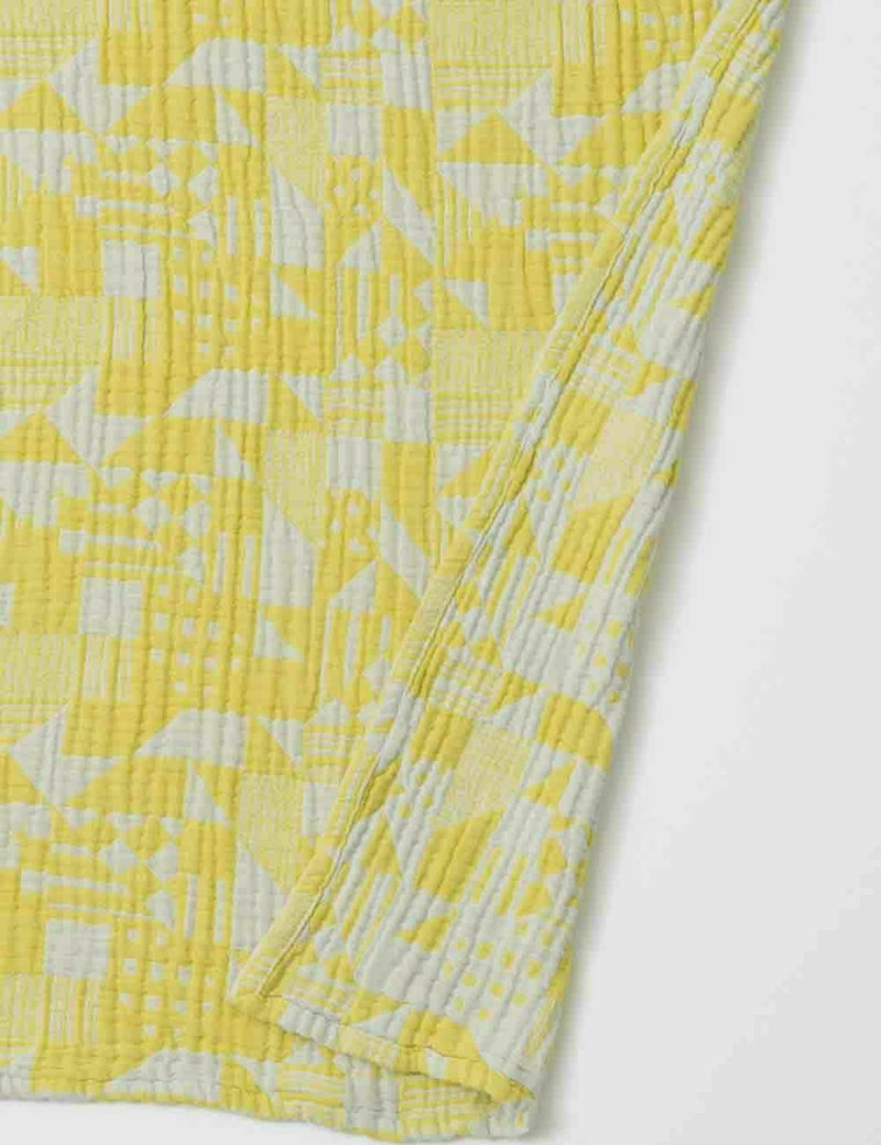 ふわふわのやわらかな生地の上に、私たちが住む石見銀山 大森町の町並みのイメージを幾何学的に表現しました。幾何学的といっても、ビシッと固い線ではなく、手描きのやわらかさを活かした群言堂らしい一枚です。