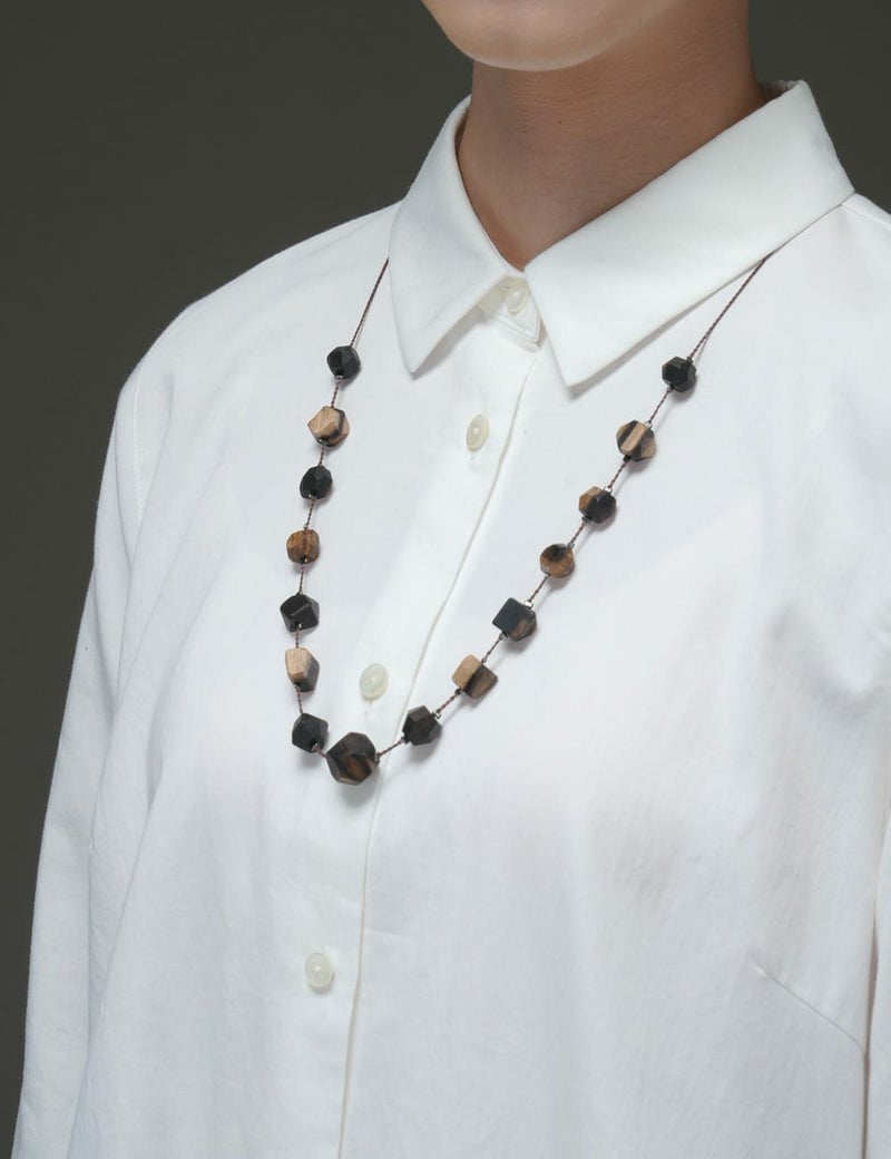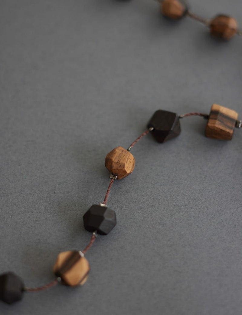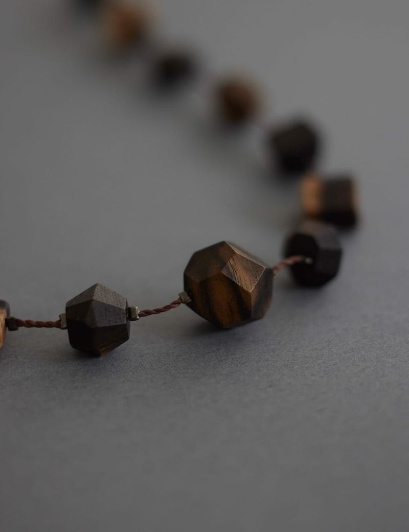 【黒柿】黒柿の工芸品は、正倉院御物にもいくつか残されていて、樹齢数百年を超えた柿の中でも稀にしか無い、独特の紋様を持った材料から作られます。自然が描いた墨絵のような、不思議で美しい景色を、ネックレスとしてお楽しみください。