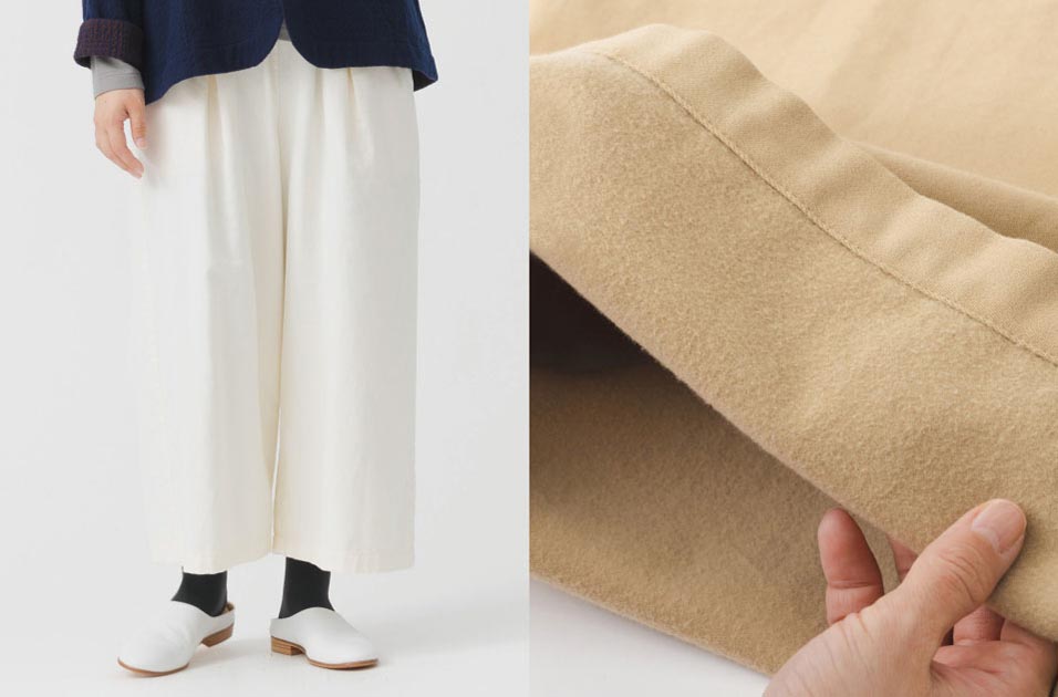 寒い季節にうれしい、肌あたりがあたたかい裏起毛パンツ。 表側は程よくつや感のあるサテン生地なので、きれい目に履いていただけます。