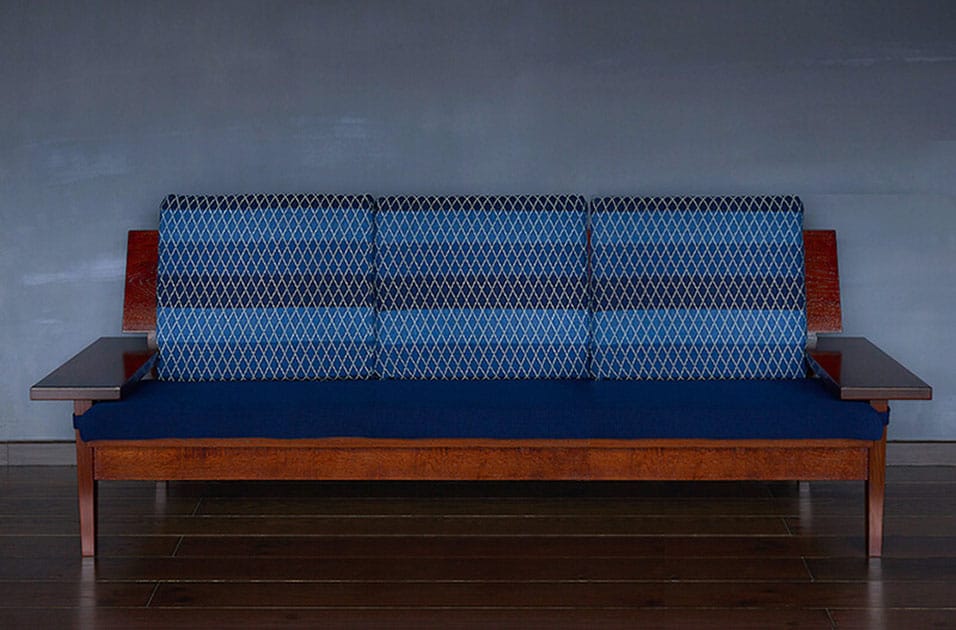 1974年の創設以来、飛騨高山の地に根を下ろし、「100年使えるものづくり」を追求してきた木工房オークヴィレッジとのコラボレーションソファ。群言堂の藍染のクッションカバーを組み合わせた、経年変化を楽しむことのできる一脚です。