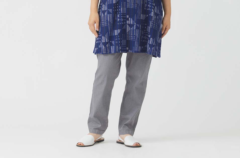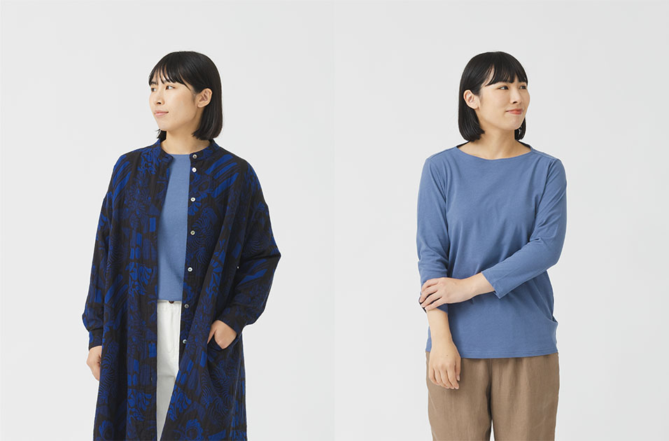 結局いちばん出番の多い「無地のカットソー」。まだまだ寒い今の時期なら重ね着のインナーとして使って、暖かくなったら一枚で着ていただけます。群言堂おすすめの「強撚コットン」シリーズは、適度な厚みがあり着やすさも抜群。綿糸に強い撚りをかけたサラサラの肌ざわりは夏も心地いいアイテムです。