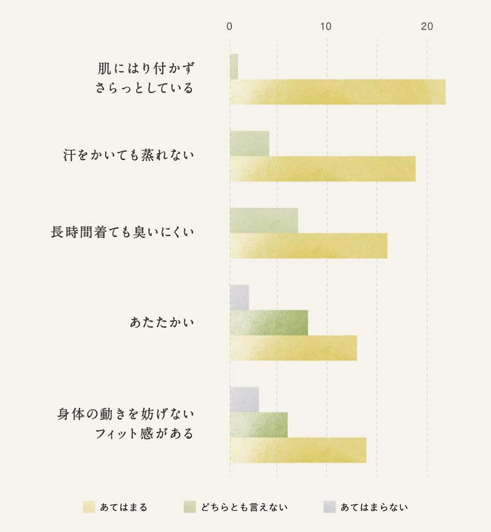 最も多かった感想は「さらっとしている」「蒸れない」という声でした。ウールは調温性、調湿性に優れた素材なので、その特性を実感する方が多数でした! 暑いときは汗を逃し蒸れない状態を保ってくれるので、これからの季節に活躍しそうですね。