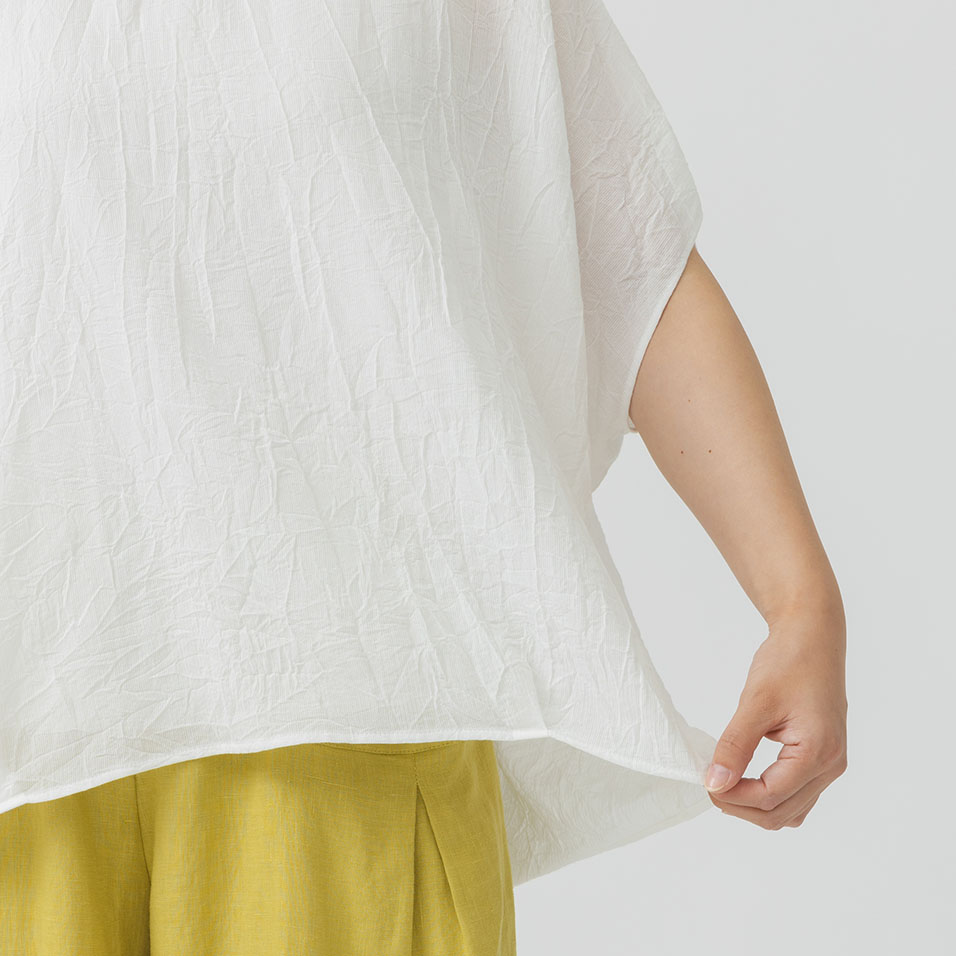 薄手のさらっとした肌ざわりの綿素材です。通気性がよくシャリ感もあり、ゆったりとしたブラウスの中を風が通って涼しく纏っていただけます。