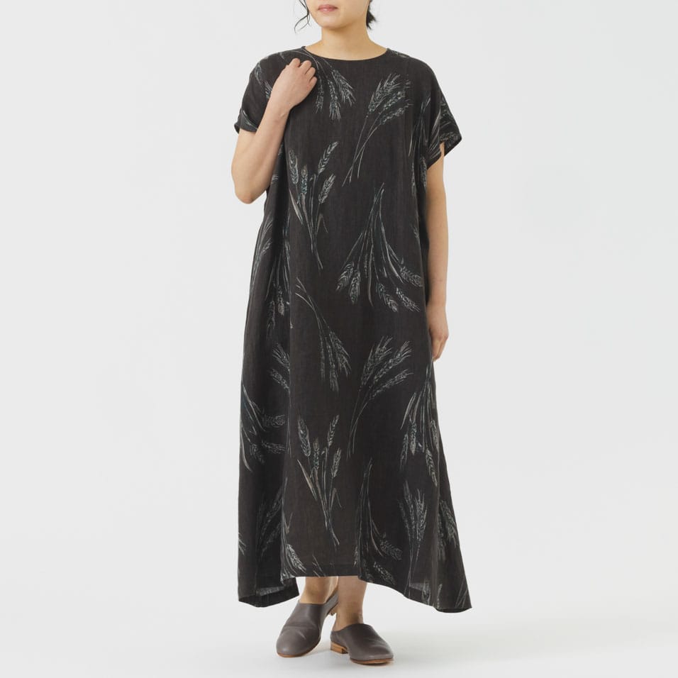 収穫を迎え、さわさわと風に揺れる麦の穂を描いたリネンの衣。