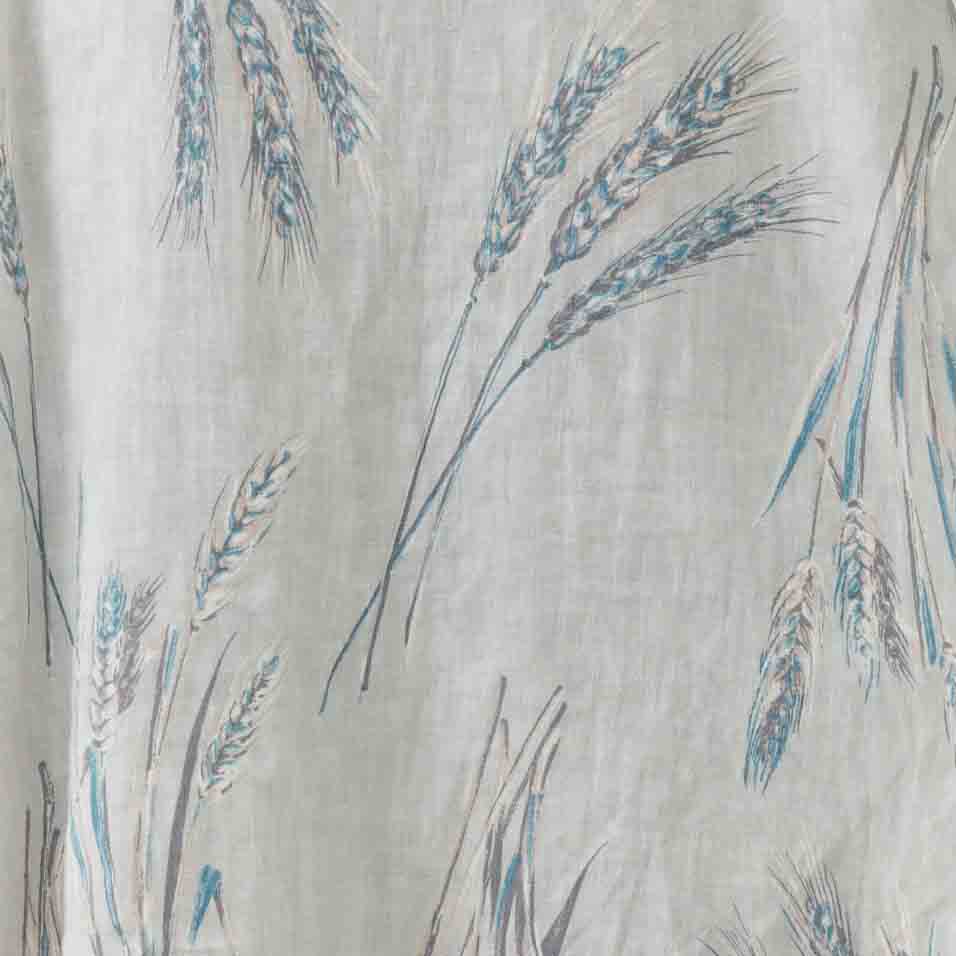まるで水彩画のようなタッチで表現された麦プリント。生地は一度地になる色に染めてから、柄が入る部分だけ色を抜き、その上に柄の色を重ね表現された手間ひまのかかった一枚です。