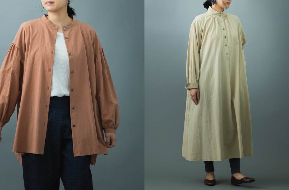 石見銀山周辺で採集した草花や枝木で染めた「里山パレット」。 薄(ススキ)、羊歯(シダ)、洋種山牛蒡(ヨウシュヤマゴボウ)で染められた、シックな秋色のブラウスとワンピースです。