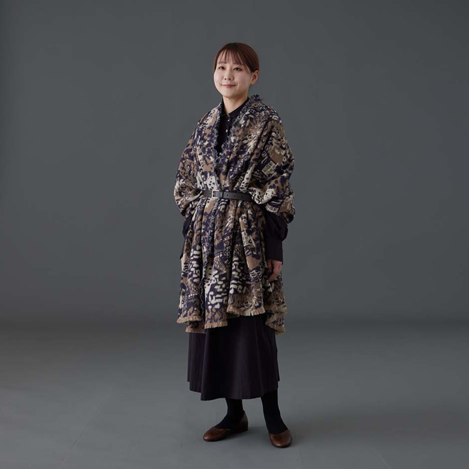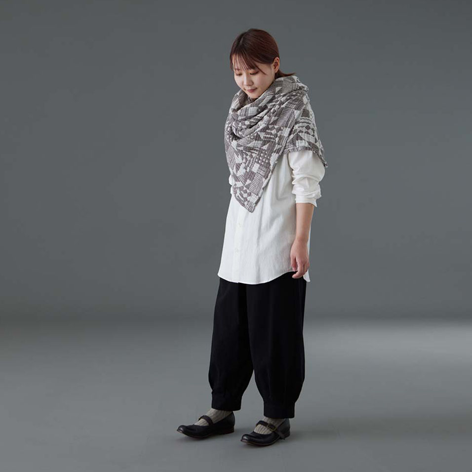 ざっくり巻いて後ろで留めるとポンチョ風になり、こなれ感のある着こなしに。