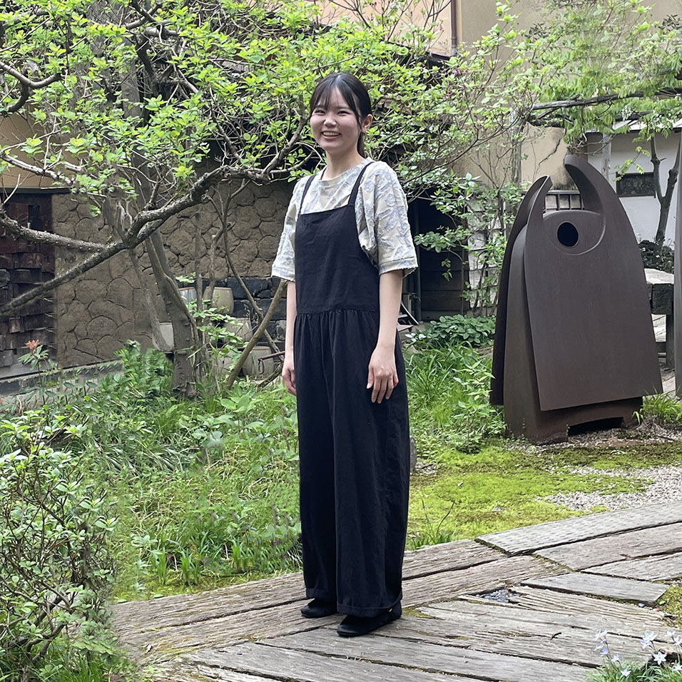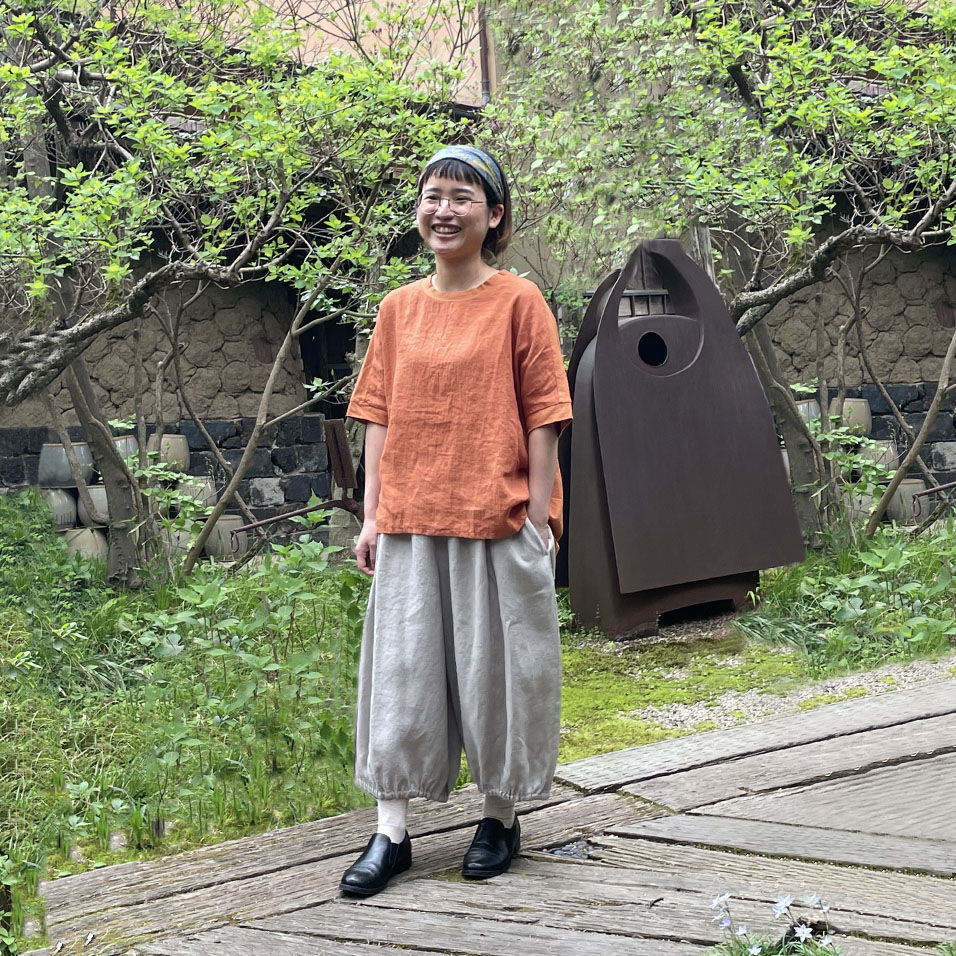 顔周りが明るく見えるこうじいろのプルオーバーは着ると元気になります!とにかく涼しいので、夏場はスタッフみんなで偶然お揃いになる日があるほど。裾がしぼってあるパンツは動きやすさ抜群です。