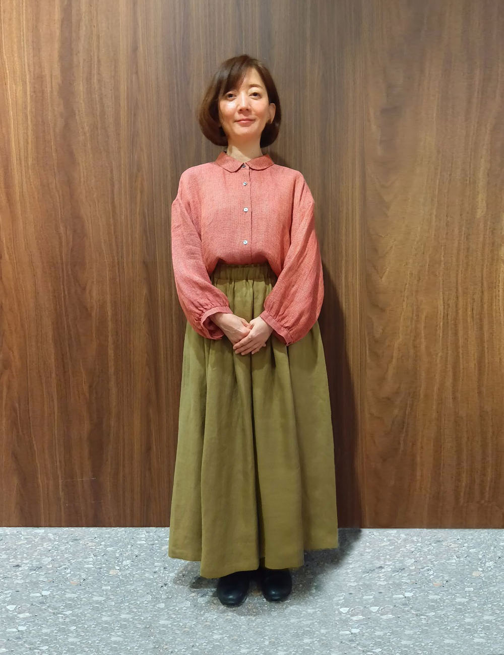 えり付きのブラウスは空気が通る軽やかな素材なので、見た目よりもずっと涼しく感じられます。肘が隠れるので、日差しが気になるこれからの季節も日焼け防止になって嬉しいです。麻素材のスカートは透け感がないため一枚でさっと穿けて涼やか。ブラウスをインするとバランス良く着用することができます!
