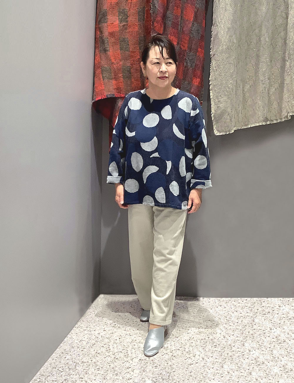 上品なインディゴカラーで大人の遊び心溢れる「月の満ち欠け柄」は、ほどよい厚みでコートを着る前の季節の変わり目にとても重宝します。自宅で気軽に手洗いできるのも嬉しいポイントです。太畝のコーデュロイパンツは肌触りがなめらか!インナーを足しながら、真冬までこのコーディネートを楽しもうと思います。