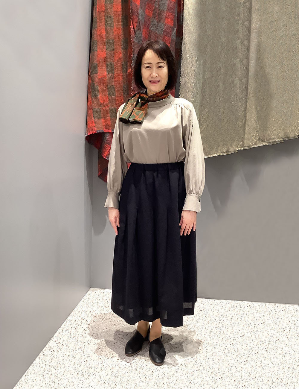 少し艶感のあるプルオーバーは、とっておきのお出かけシーンにもぴったり。アクセントになる「すすき柄のスカーフ」は、頭や首に巻いたり肩にかけたりと、体温調節にも役立ちます。今年の秋はこのコーディネートで美術館巡りに行きたいです。