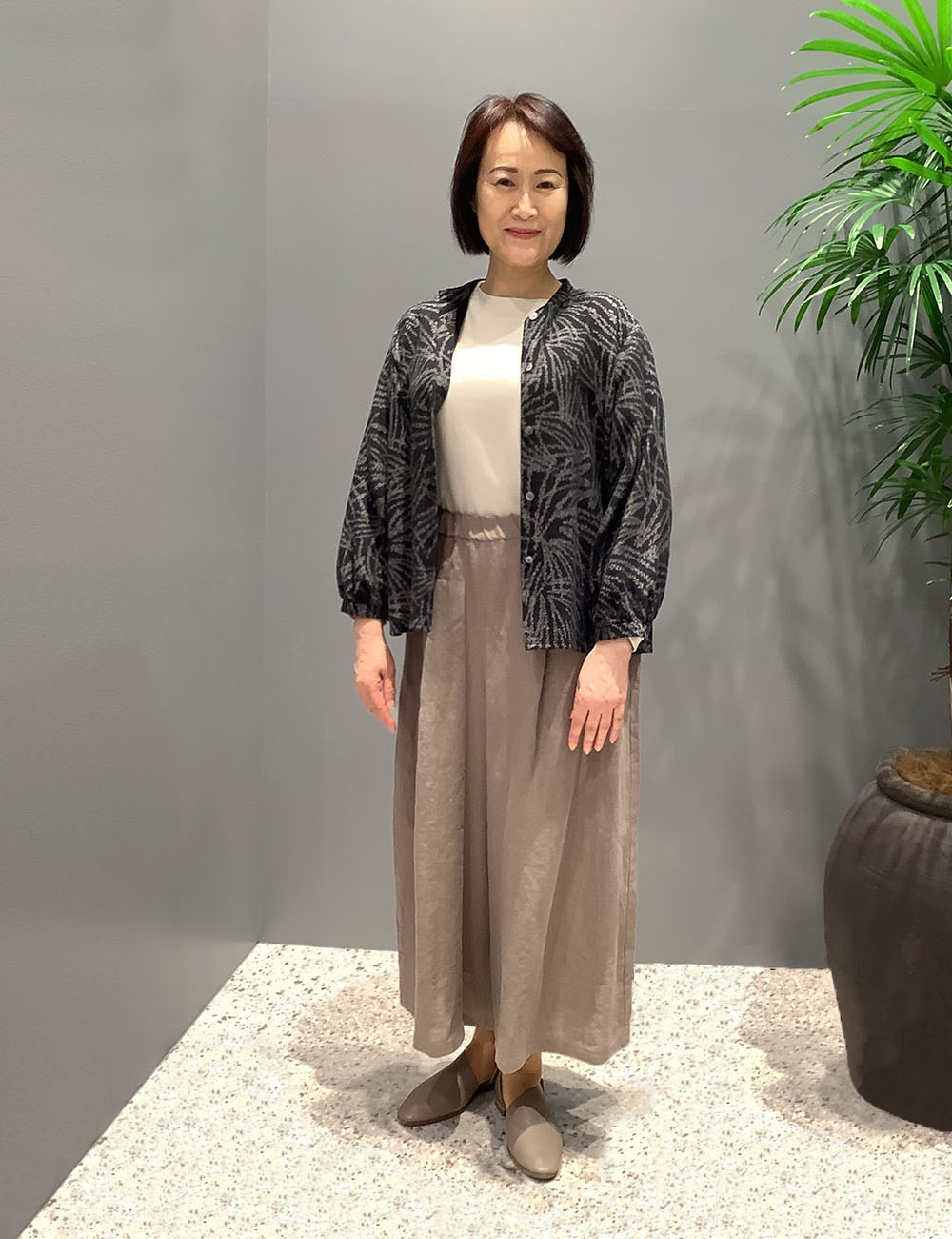 「ススキ柄」のマンガン絣のブラウスを羽織り代わりに、落ち着いたナチュラルトーンでまとめてみました。インナーのはいじろで軽さを出していますが、ブラウスのボタンを全て留めるときちんと感が出て印象が変わります。