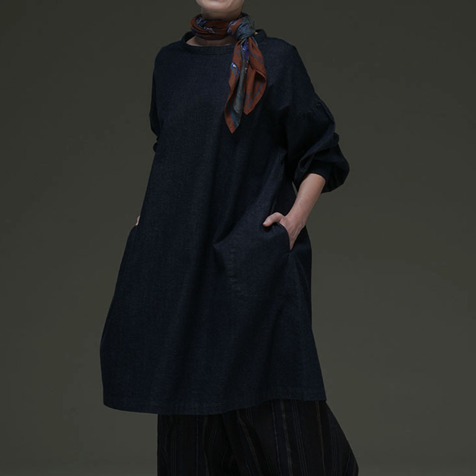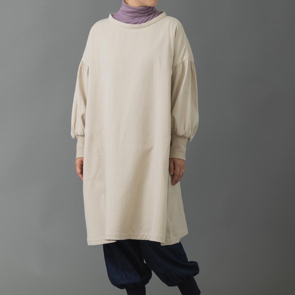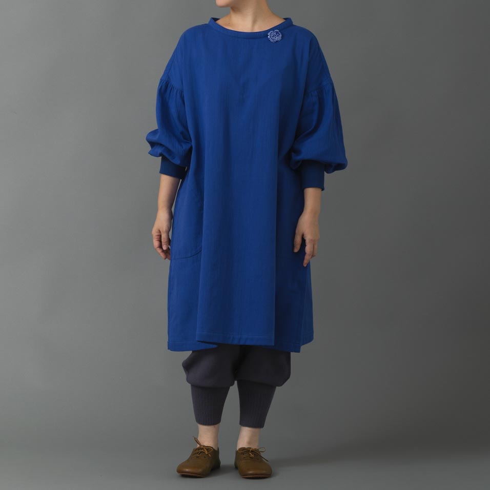 かっぽう着からヒントを得た、袖リブ付きのらくちんワンピース。 おうち仕事に気合を入れたいときは、袖をぎゅっと上げて。たっぷり身幅で、冷え込みに備えての重ね着もへっちゃらです。 キレイ色だからもちろんお出かけにも。合わせるアイテムや小物で、自分好みにアレンジできる“ごきげんウェア”です!