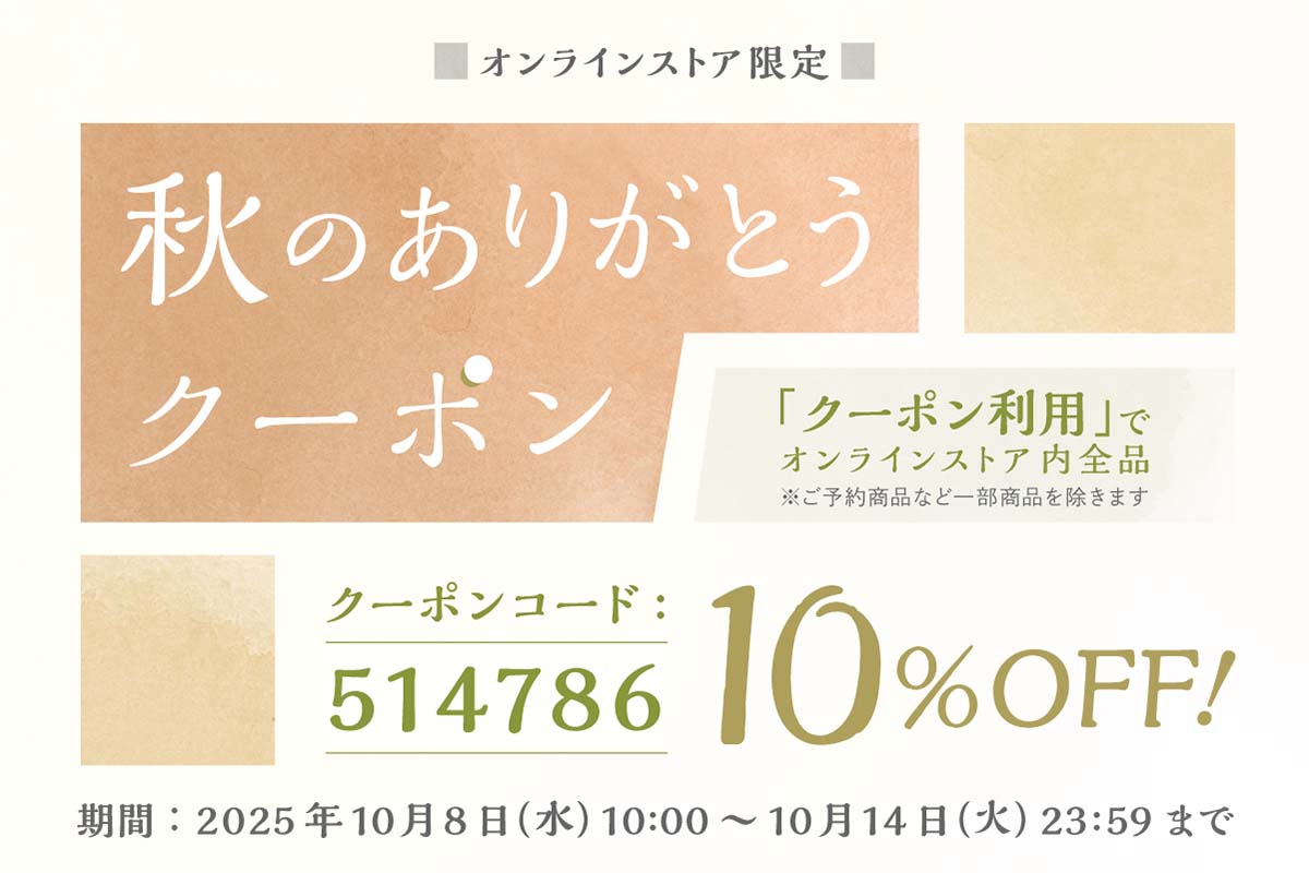 ※クーポンコードをご入力されていないご注文や、発送待ちのご注文、対象期間以外のご注文は割引適用外とさせていただきます