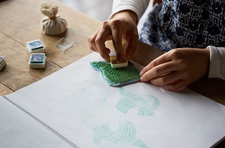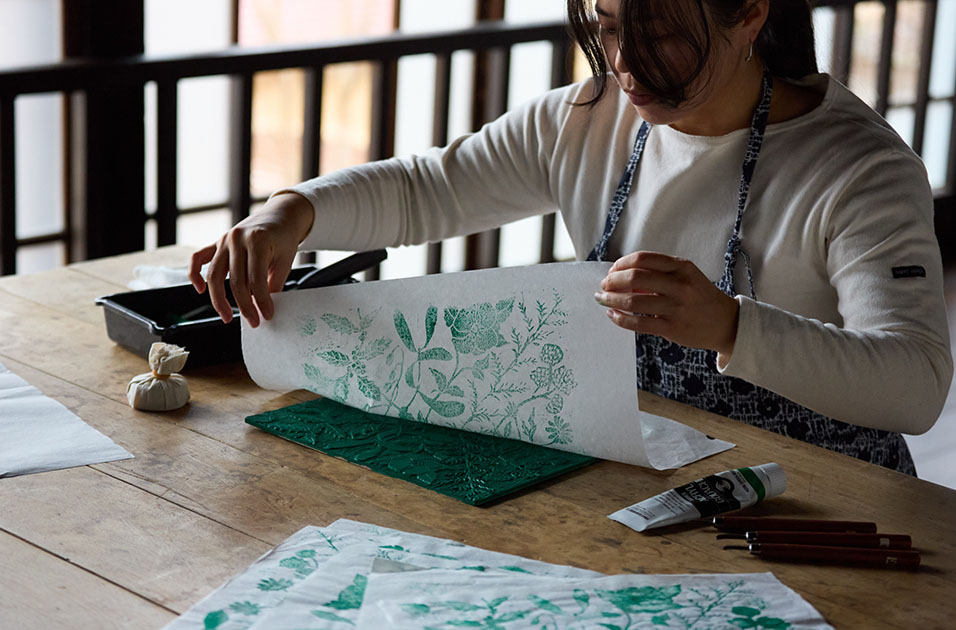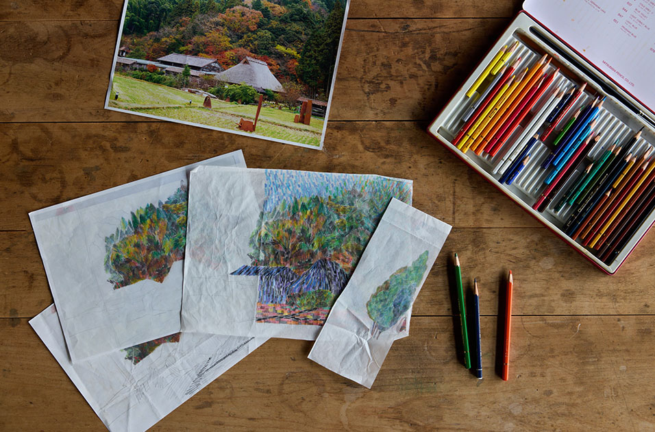 里山に息づく発想と感性が、あらゆる手法で図案に落とし込まれ、多くの工程を経て一枚の布に映し出されます。