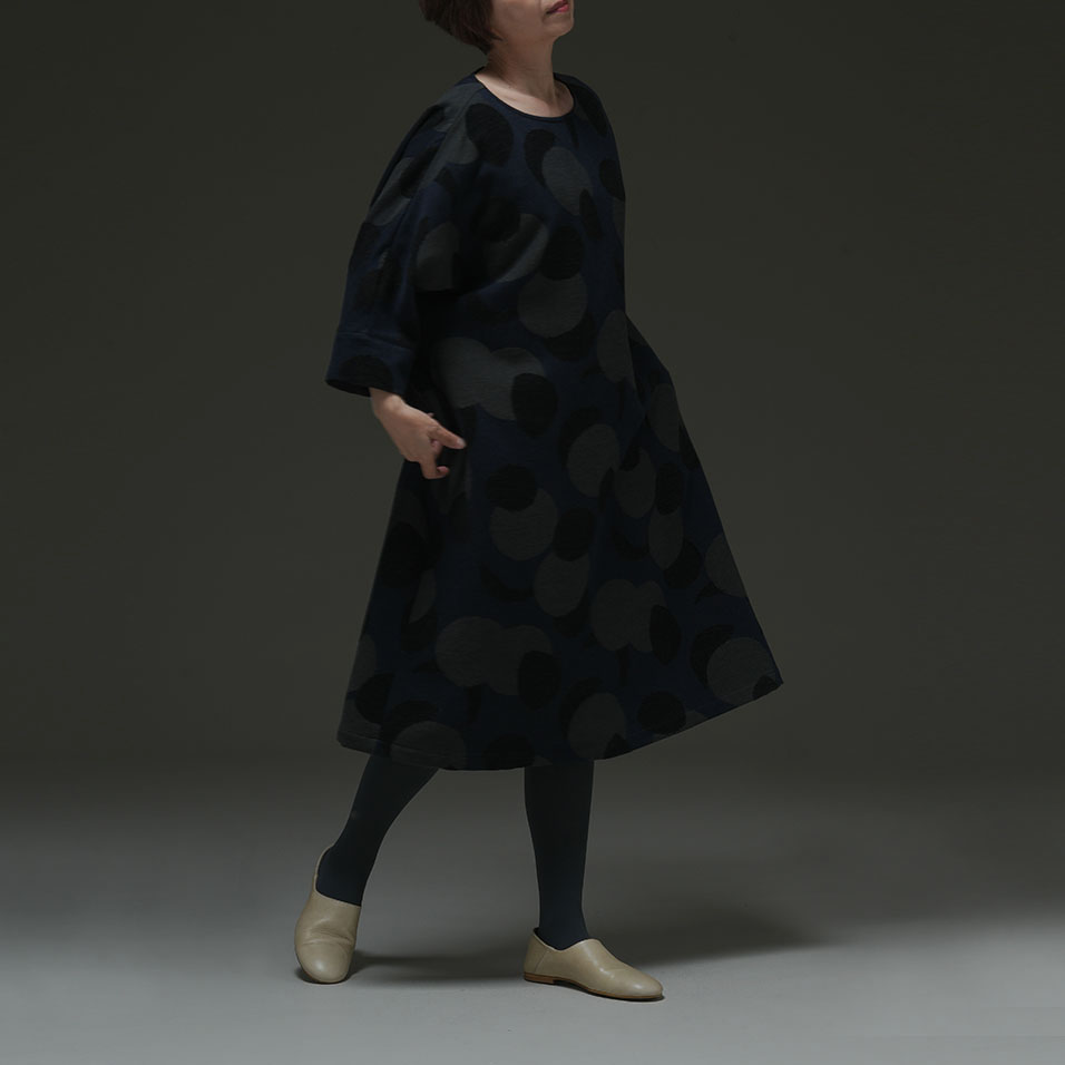 夜空を思わせるインディゴの先染め糸の中に、ふわふわとした毛羽感のある綿モール糸を織り込んで、月の光と影を表現した独創的なジャガード織。ふっくらとしたふくらみを醸し出しながら重さを感じさせないよう、糸量の調整や織り方に工夫を重ね、何度も試作を繰り返して完成させました。