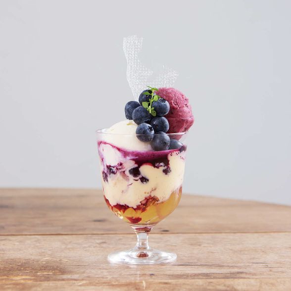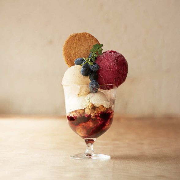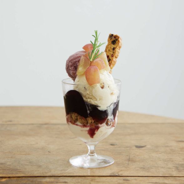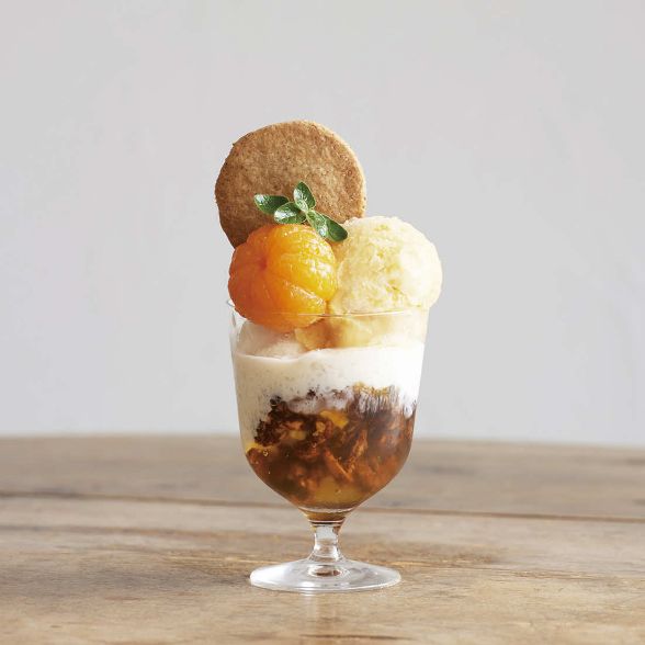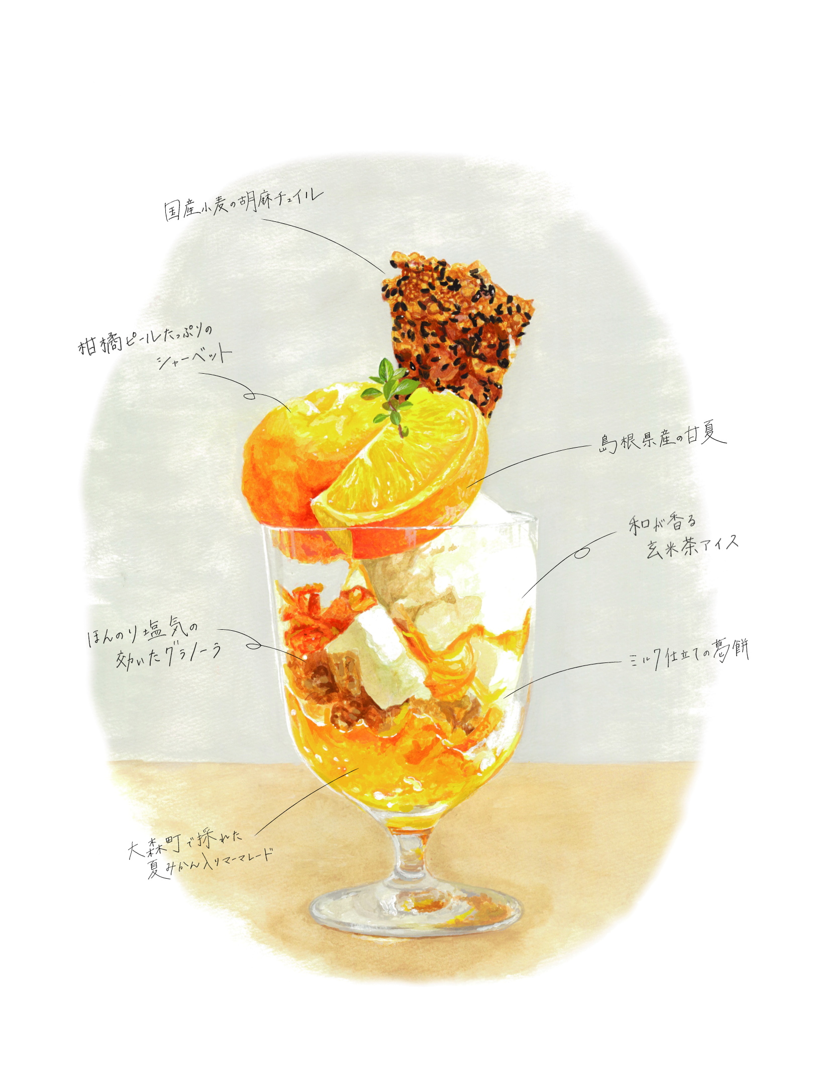 町内の放棄果樹で実った夏みかんに、近隣地域で採れた甘夏。2種の柑橘の爽やかさを玄米茶アイスやミルク葛餅、五穀チュイルが引き立てます。